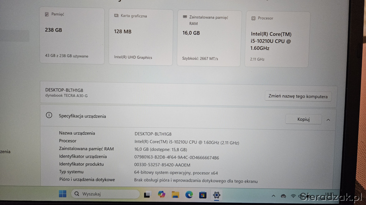 Na sprzedaż mam laptopa Toshiba Dynabook Tecra A30-G.