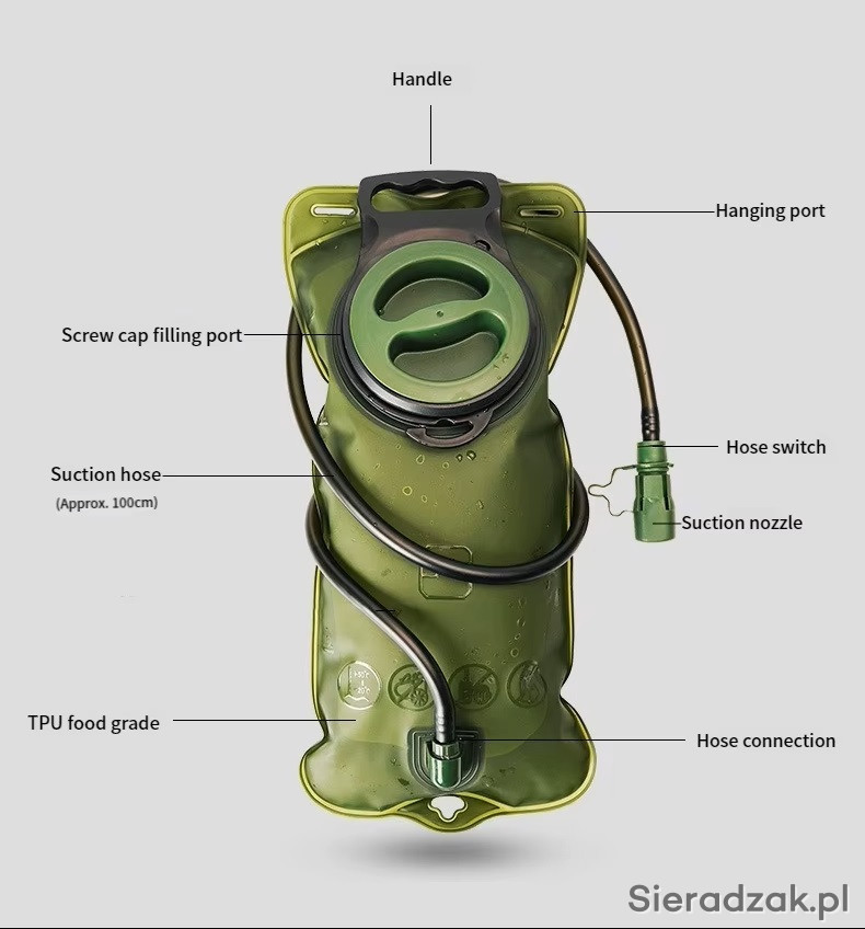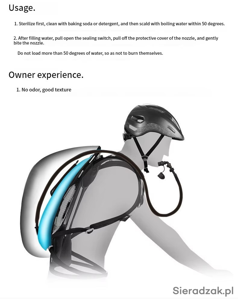 Bukłak wyprodukowano z lekkiego, a zarazem solidnego tworzywa TPU. Dzięki temu akcesorium jest trwałe. Doskonale sprawdzi się podczas wielogodzinnych wycieczek, gdy nawodnienie organizmu stanowi kwestię priorytetową.