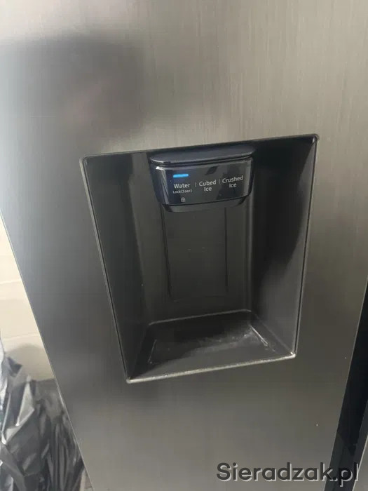 Lodówka typu Side by Side z kostkarką i dystrybutorem wody. Pojemność całkowita ok. 634 l (409 l chłodziarka, 225 l zamrażarka).