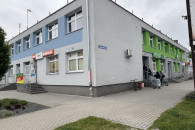 Budynek po termoizolacji w 2021 roku , wokół budynku znajduje się parking , tereny zielone oraz przystanek autobusowy