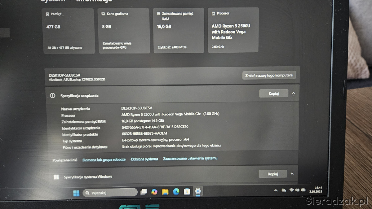 Na sprzedaż mam laptopa typowo gamingowego do gier Asus X570Z ma szybki procesor AMD Ryzen 5 , aż dwie karty graficzne NVIDIA GTX 1050 ( mocniejsza wersja z 4gb vram) oraz AMD Vega 8, 16gb pamięci RAM, Dysk SSD 512gb.