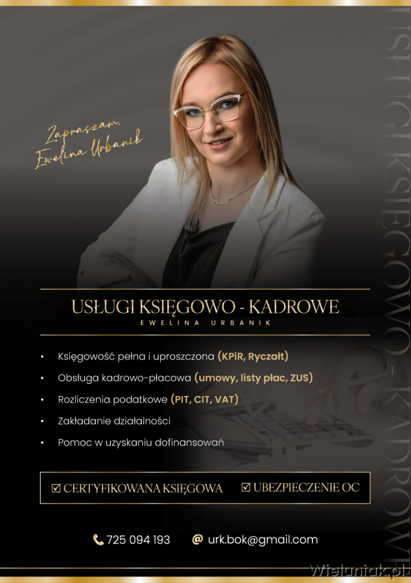 Oferuje kompleksowe usługi księgowe i kadrowo-płacowe dla firm i jednoosobowych działalności. Pełna księgowość, KPiR, deklaracje VAT, PIT, ZUS, rozliczenia roczne i doradztwo podatkowe. Posiadam ubezpieczenie OC biura rachunkowego, gwarantując bezpieczeństwo i profesjonalizm. Księgowość online i stacjonarna ( Wieluń, powiat wieluński, Pajęczno, Osjaków, Wieruszów i inne miejscowości )– szybko, terminowo i z indywidualnym podejściem do każdego klienta.