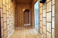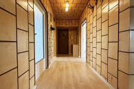 ► Duży, przestronny korytarz, na podłodze panele, ściany w boazerii.