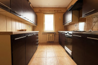 ► Ustawna kuchnia wyposażona w meble oraz sprzęty AGD. Na podłodze kafle, na ścianach glazura i boazeria.