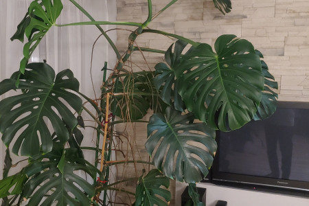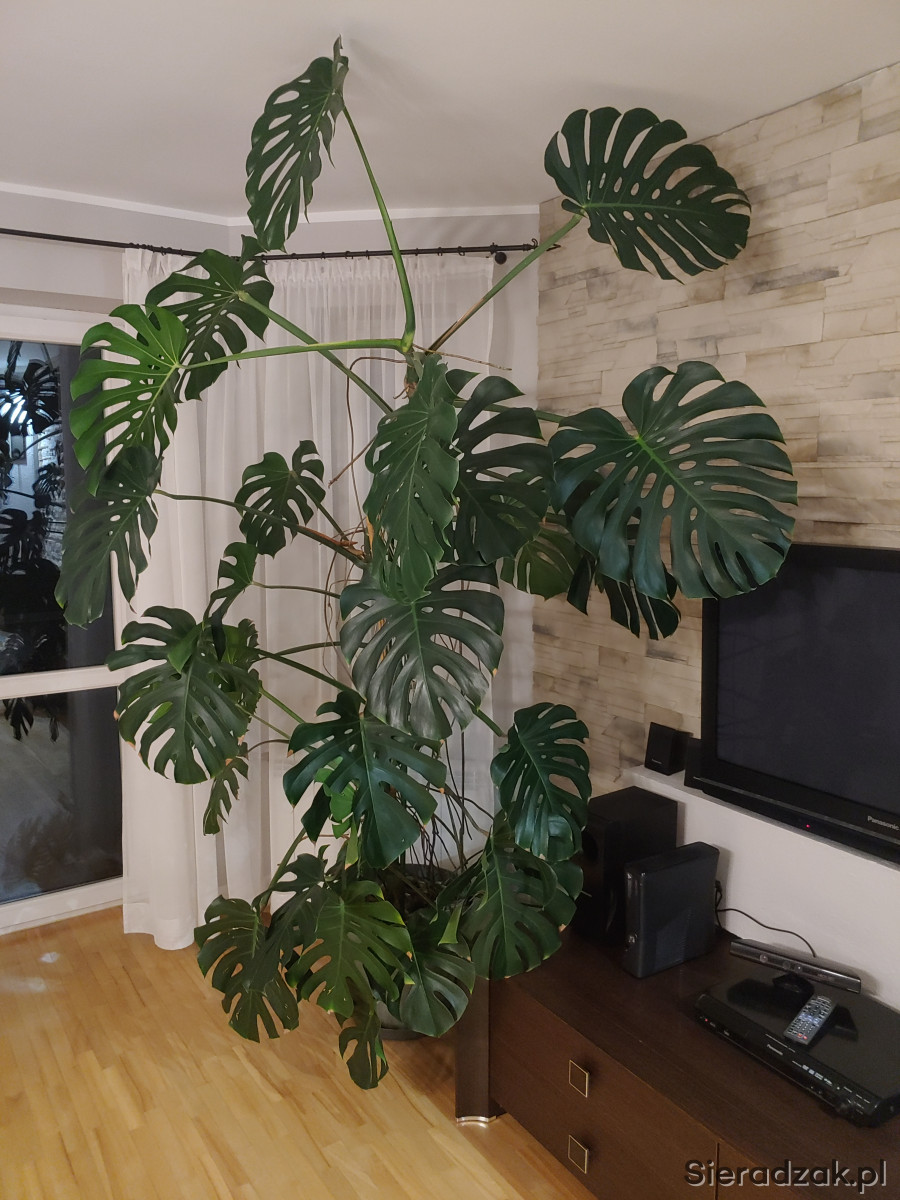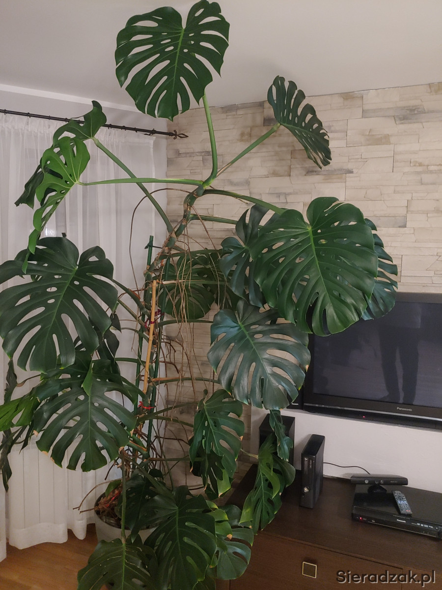 Kwiat monstera, wysokość około 2,5m, w ładnej doniczce. Okazały, zadbany kwiat do salonu.