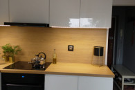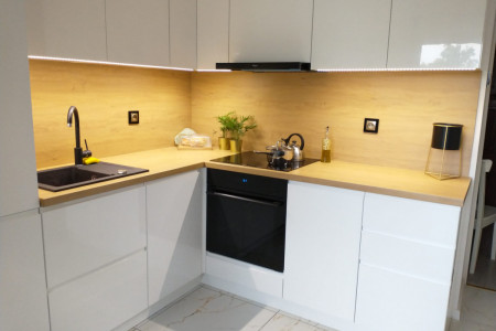 *pełna zabudowa ze sprzętem AGD - lodówka z zamrażarką, piekarnik, kuchenka indukcyjna, zmywarka, okap
