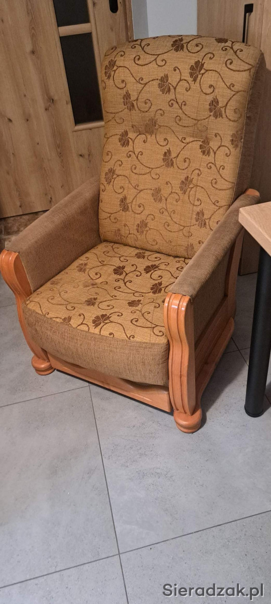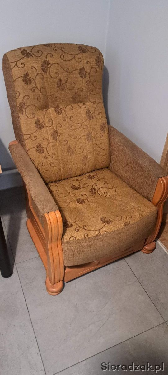 fotel wypoczynkowy z drewnianymi podłokietnikami i tapicerką w kwiatowy wzór.