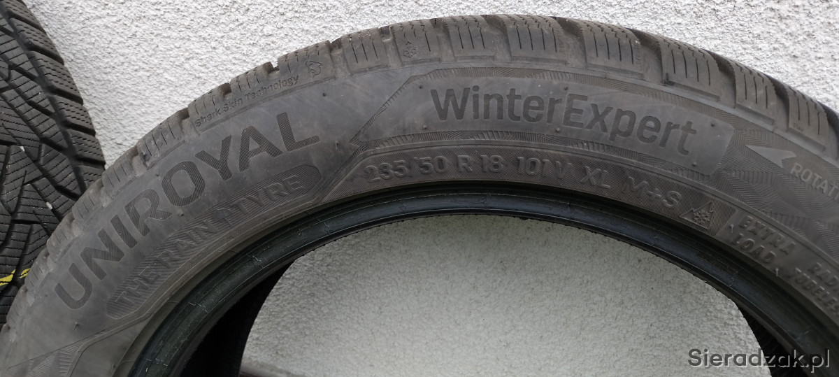 Sprzedam 4x opony zimowe Uniroyal 235/50 R18 101V, DOT 3422, bieżnik 4x7mm. Opony w bardzo dobrym stanie jak na zdjęciach, po niewielkim przebiegu. Gwarancja rozruchowa. Więcej inf. 501 448 506. Nie odpisuję na SMS.