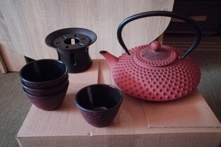 Mam na sprzedaż wspaniały zestaw zawierający: 1x żeliwny imbryk o pojemności 1.25 L wraz z zaparzaczem, 4x żeliwne czarki oraz żeliwny podgrzewacz.