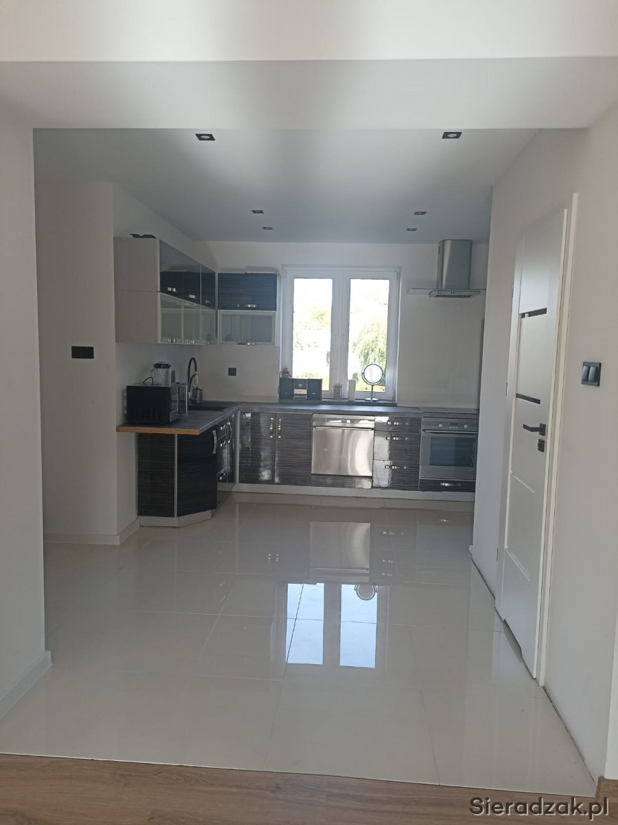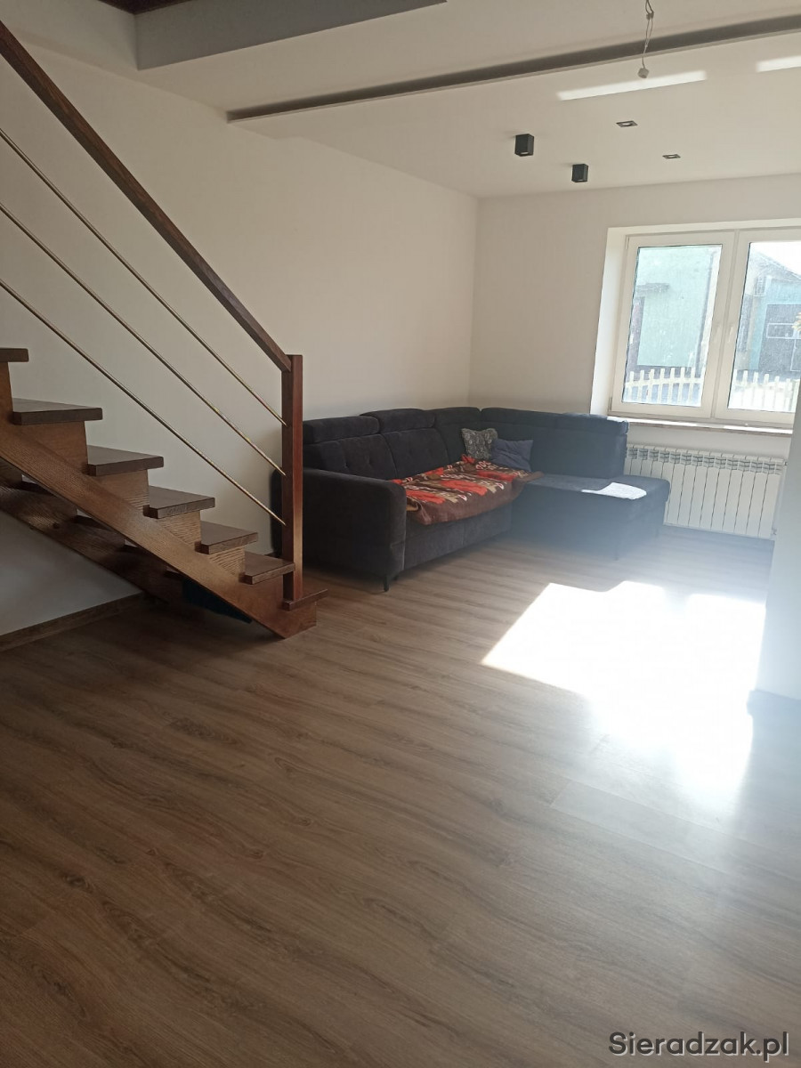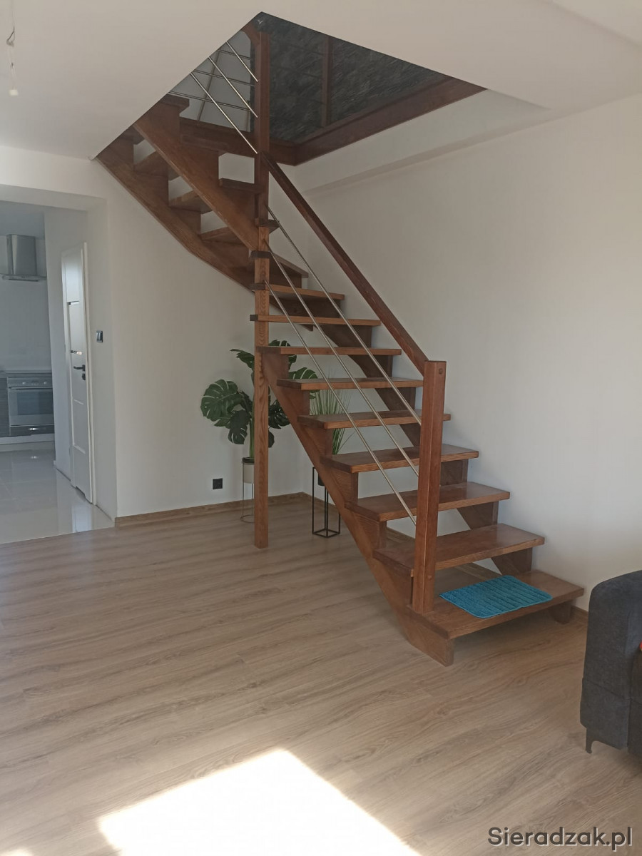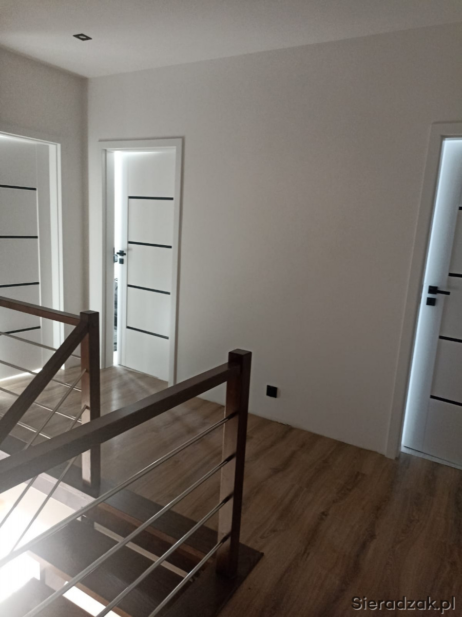 Na ścianach gładzie i na podłodze panele. Kuchnia w płytce i meblach, łazienka u góry w płytkach wykończona, zamontowane nowe schody drewniane połączone z kwasówką.