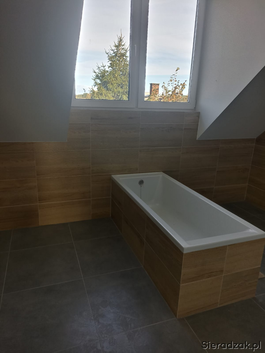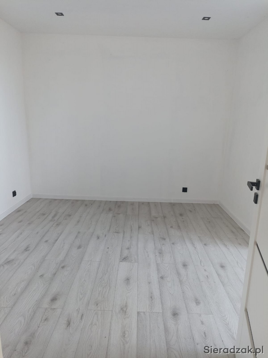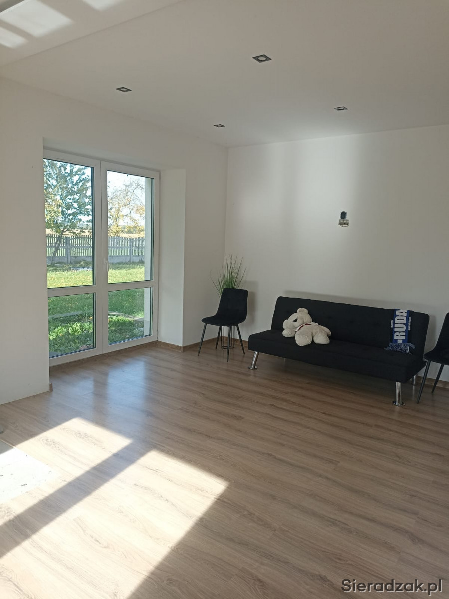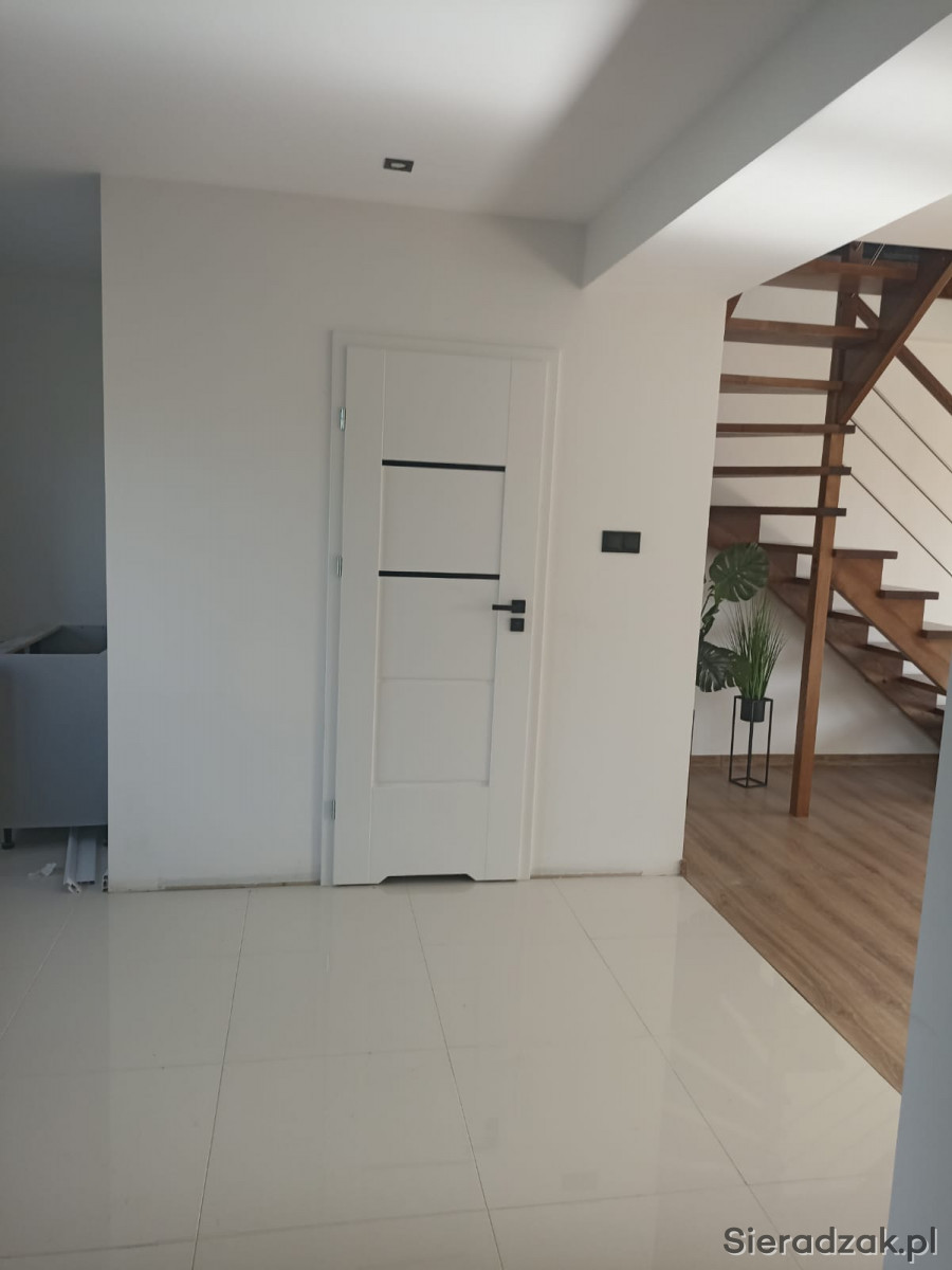 Na ścianach gładzie i na podłodze panele. Kuchnia w płytce i meblach, łazienka u góry w płytkach wykończona, zamontowane nowe schody drewniane połączone z kwasówką.
