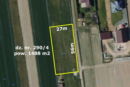 Działka w o wymiarach szerokość ok. 27m. długość ok. 56 m.
