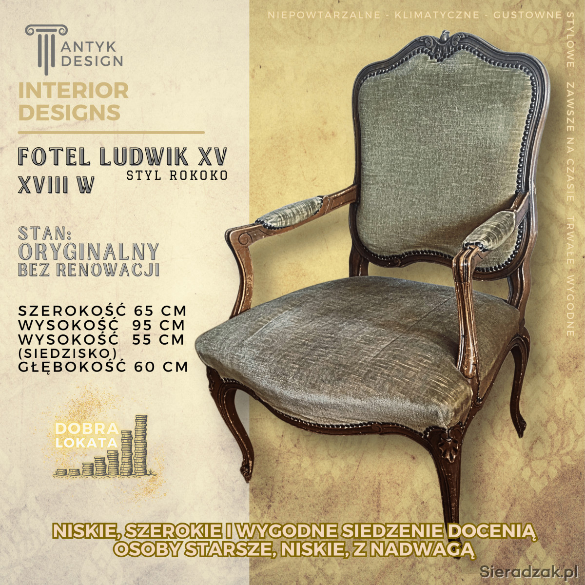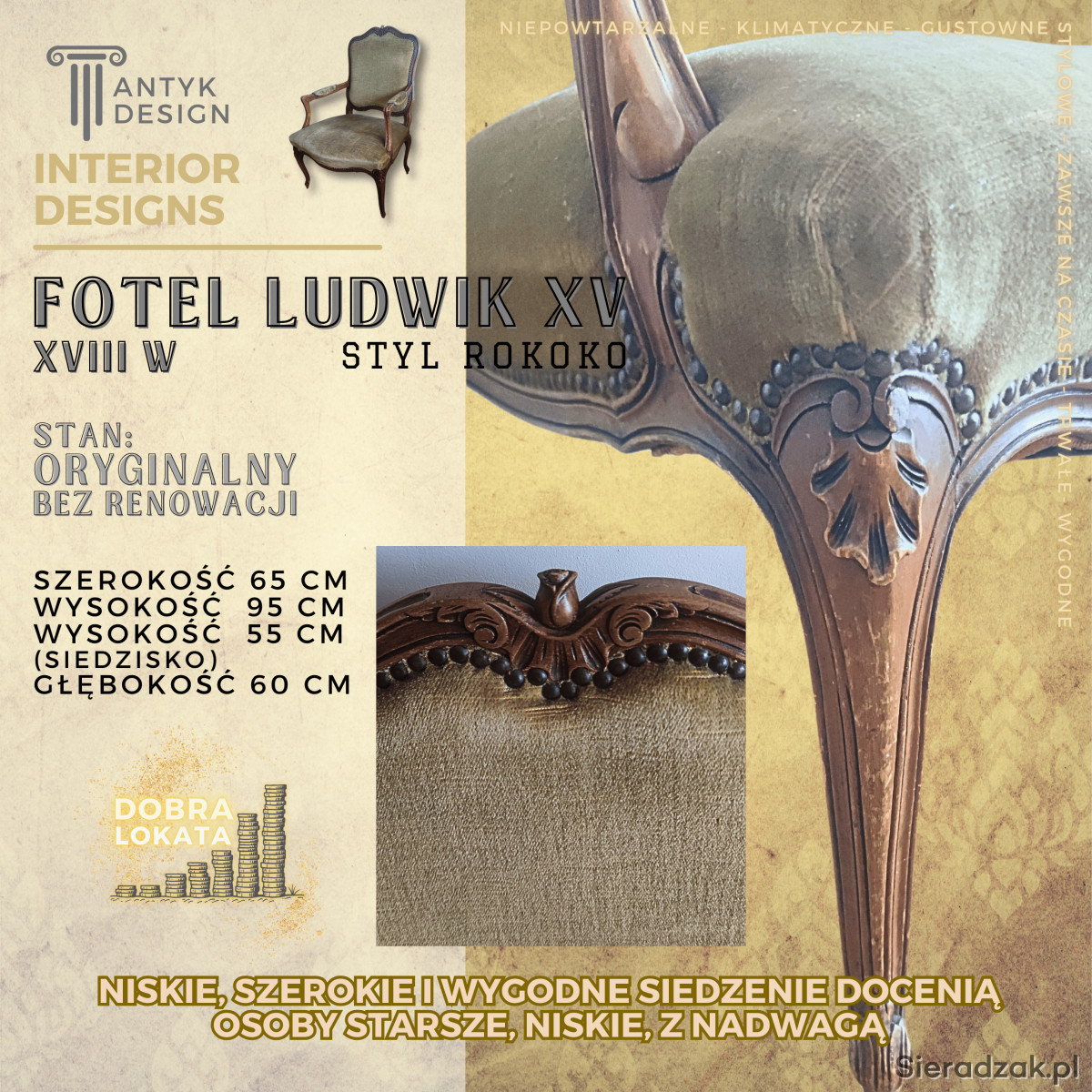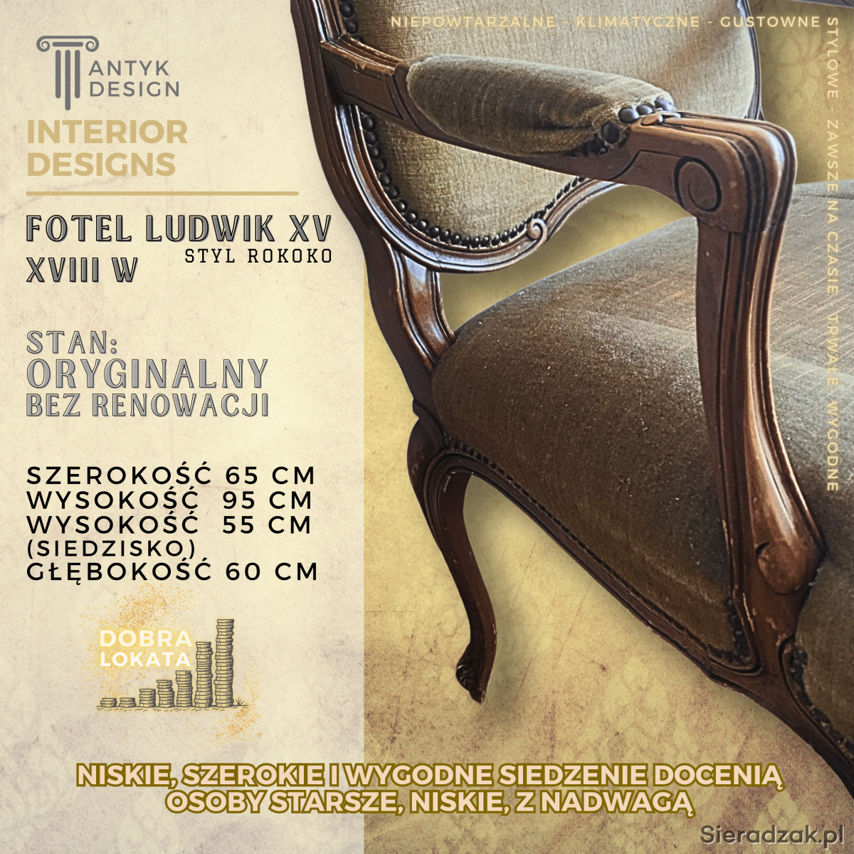 Fotel ten, to mebel z tak zwaną duszą. Posiada on swój własny charakter i historię, co czyni go unikatowym.