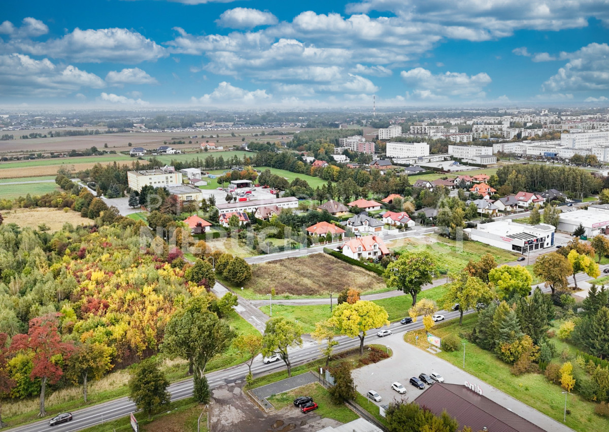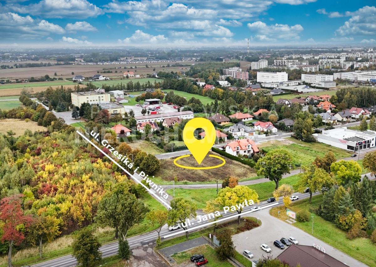 Działka ma kształt zbliżony do kwadratu, z dostępem do trzech ulic, co daje ogromne możliwości aranżacji wjazdu, parkingu czy ekspozycji reklamy.