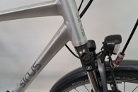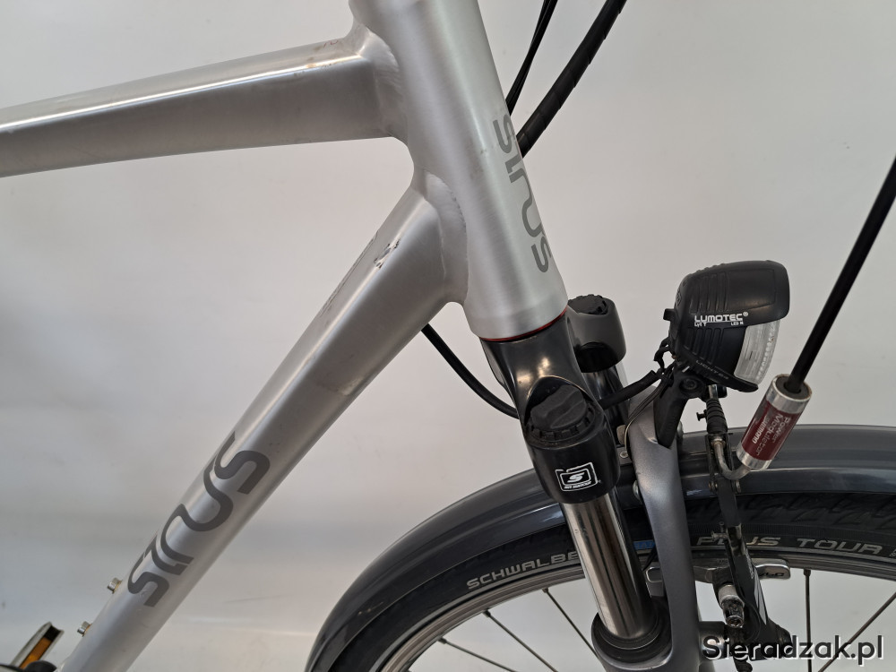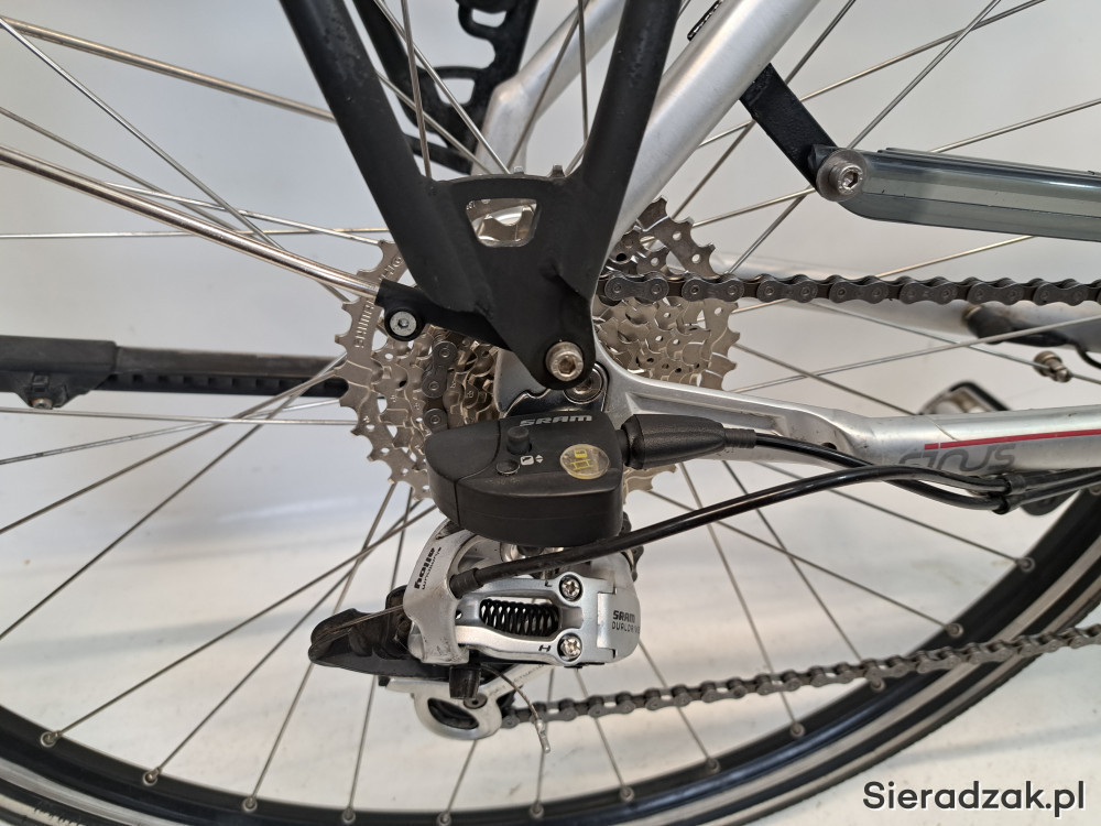 rama aluminium 22" 56cm (XL),przerzutka planetarna sram dual drive 3 biegi w piaście + napęd 9-rzędowy,hamulce v-brake shimano,manetki sram dual drive,oświetlenie lumotec zasilane z dynama shimano w przednim kole,siodełko selle royal z amortyzowaną sztycą podsiodłową,zabezpieczenie tylnego koła abus,amortyzator sr suntour nex 4110