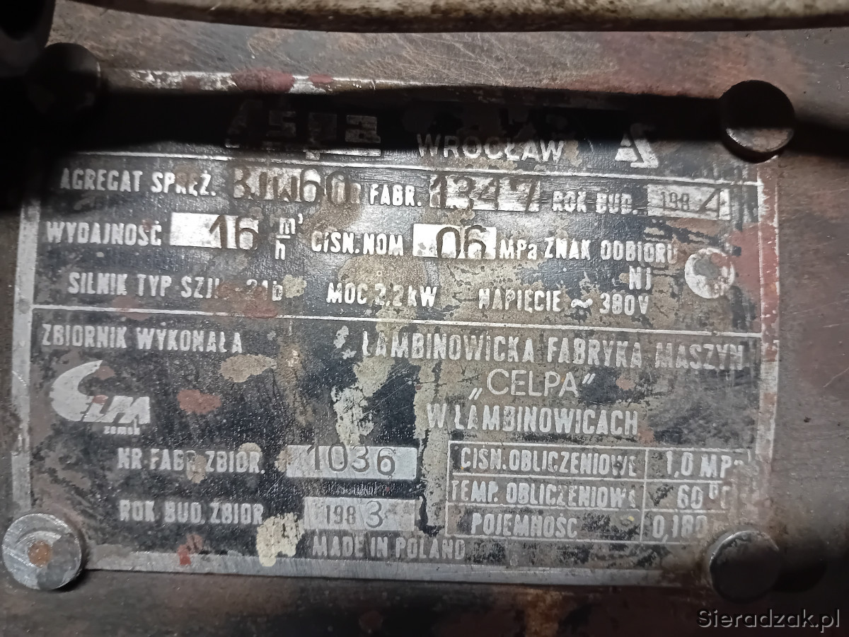 Sprzedam kompresor ASPA 3JW60 w bardzo dobrym stanie technicznym, silnik 2,2 kw, max. ciśnienie robocze 5 bar, butla 180l