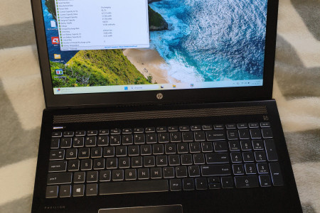 Laptop ma podświetlaną klawiaturę, laptop w pełni sprawny w ładnym stanie wizualnym, zwykłe ślady użytkowania, matryca FullHD 15.6 cala.