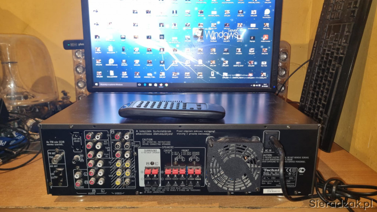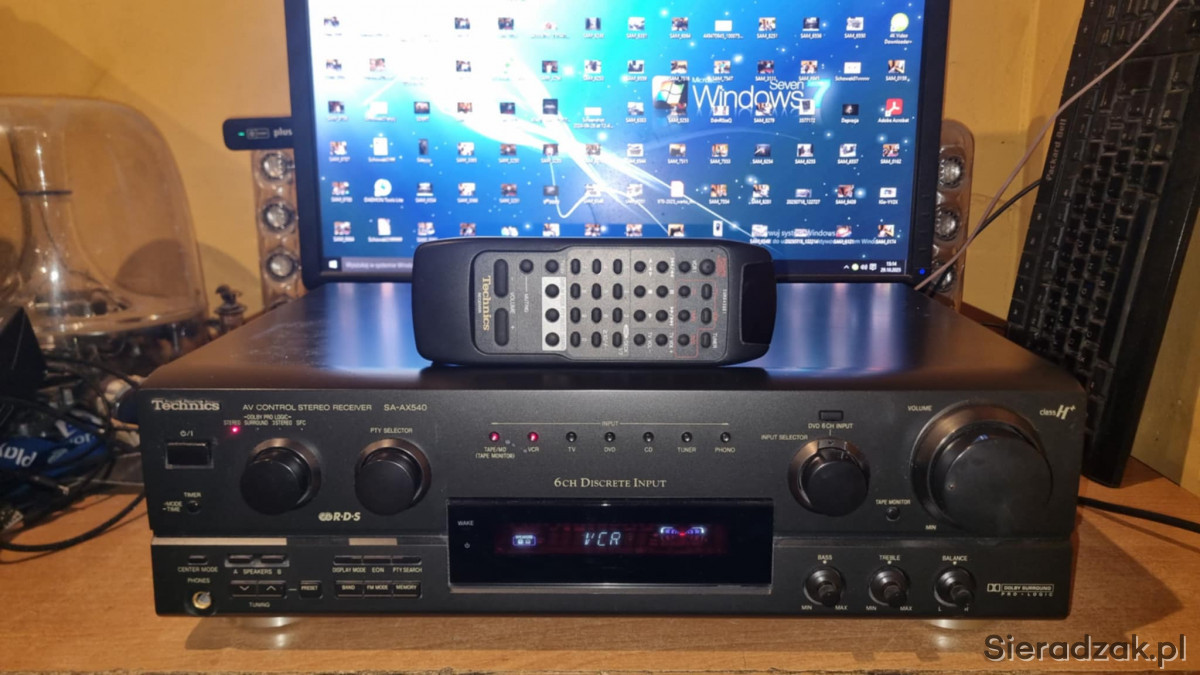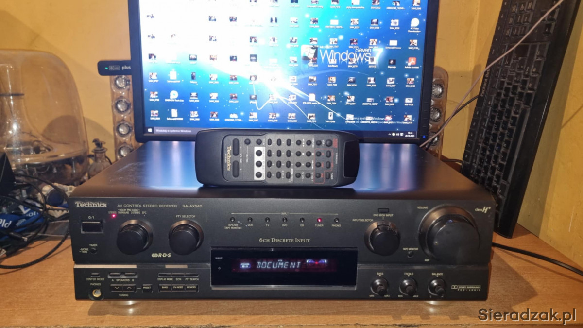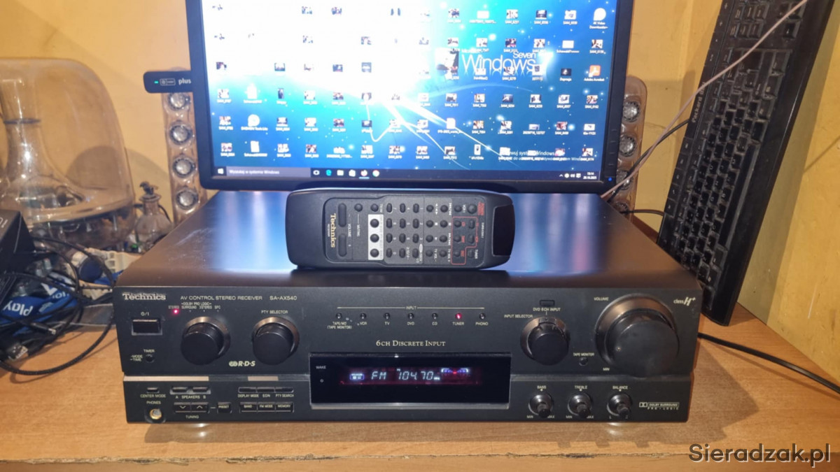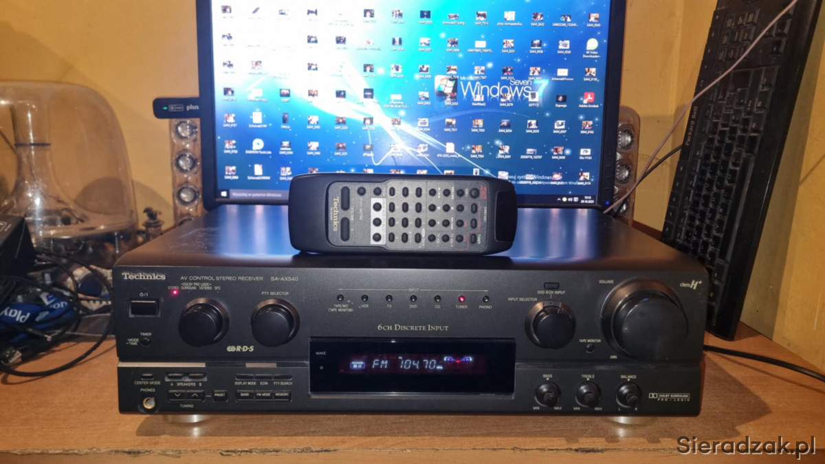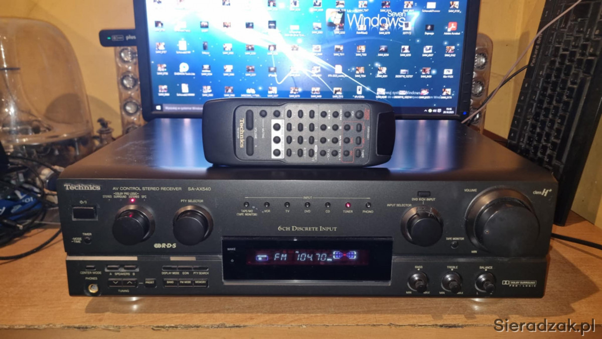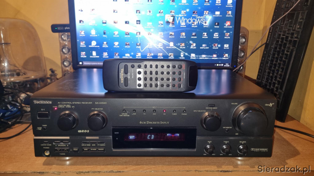 Amplituner sprawny w stanie jak na foto. W komplecie pilot zdalnego sterowania od innego modelu obsługujący podstawowe funkcje oraz sterowanie odtwarzaczem CD marki Technics. Polecam.