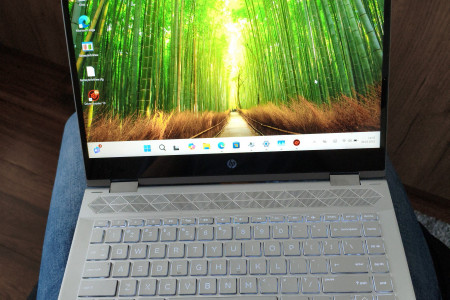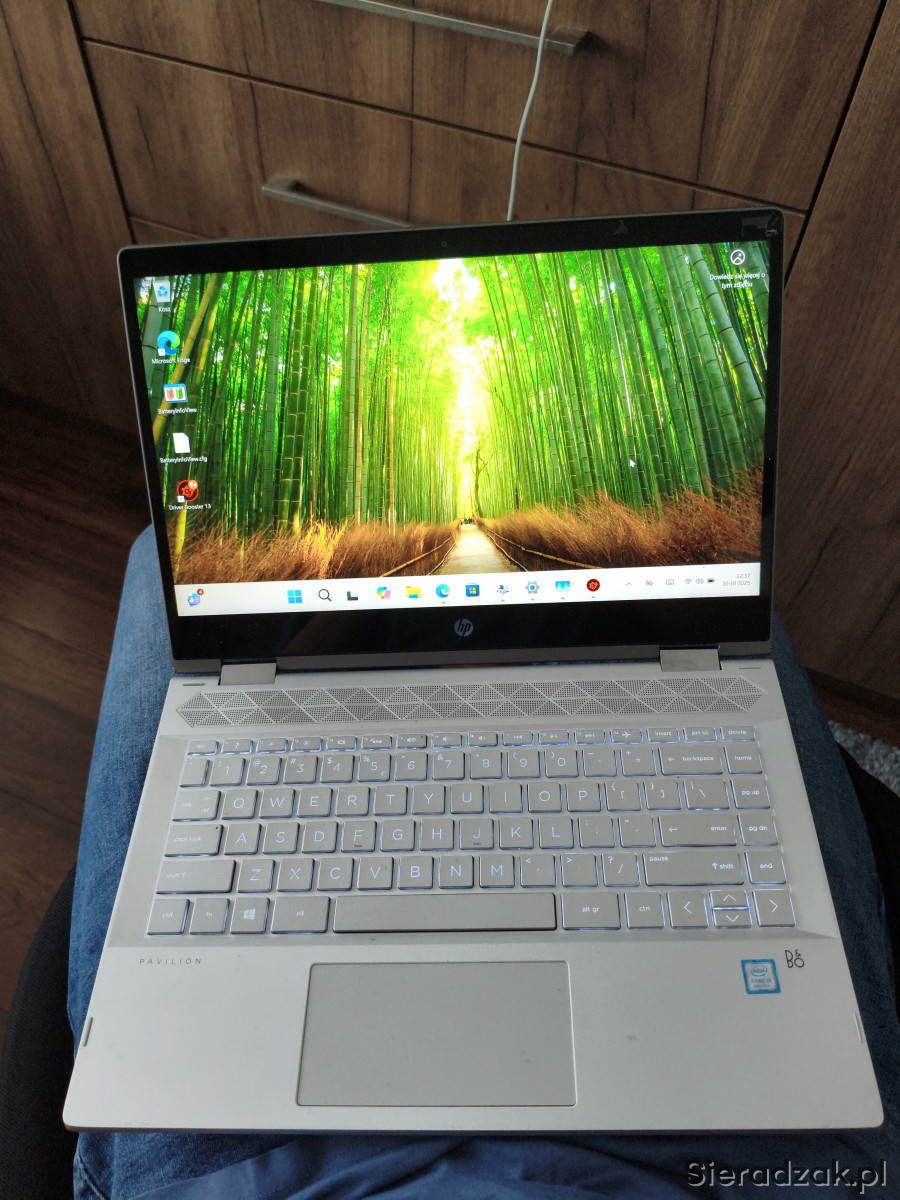 Laptop HP Pavilion X360 z procesorem i3-8145u, 8 GB RAM i dyskiem SSD 256 GB. Bateria w 100% żywotności, podświetlana klawiatura, czytnik linii papilarnych i głośniki Bang olufsen.