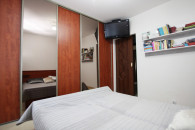 W pierwszej sypialni pojemna szafa w zabudowie typu komandor, łóżko sypialniane wraz ze stolikami nocnymi, półki i telewizor.