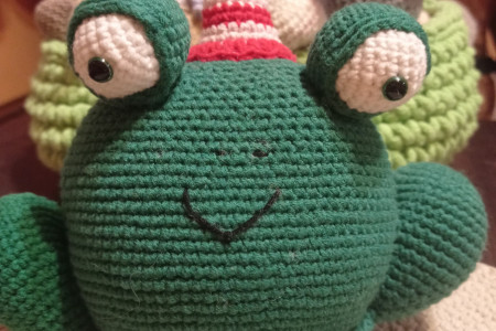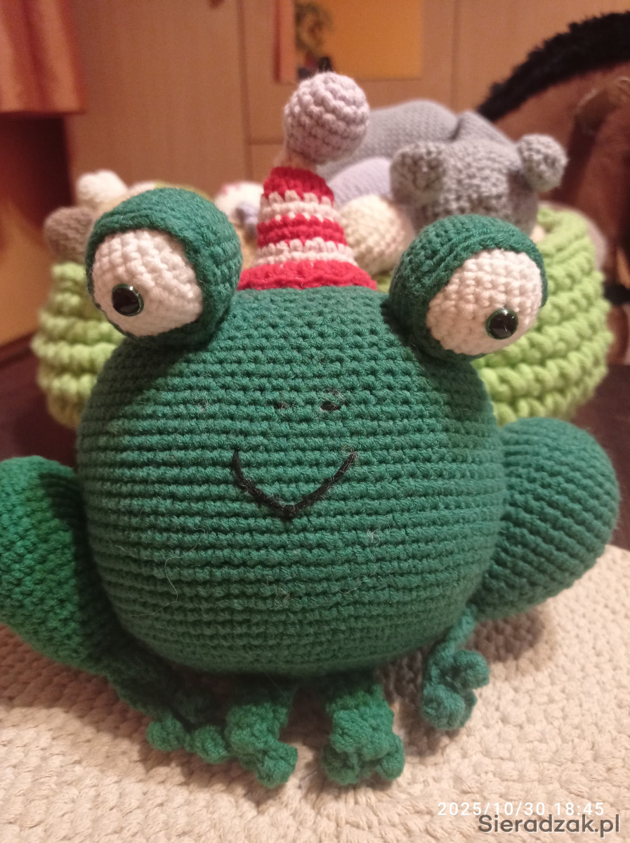 Własnoręcznue wykonana żaba na szydełku z bezpiecznej bawełnienej włóczki, bezpieczne oczy, siedząca żabka