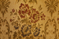 Elegancki, drewniany stołek z tapicerowanym siedziskiem w kwiatowy wzór.