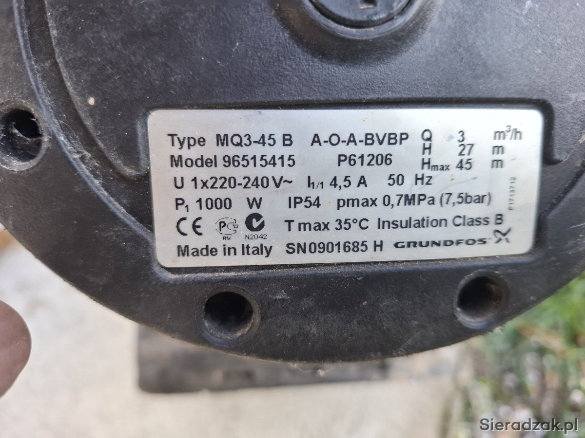 Sprzedam Pompę hydroforową Grundfos MQ3-45B w stanie dobrym. Działała do wymiany na inną (zmuszony byłem zakupić pompę głębinową).