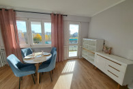 jasnego i przytulnego salonu z wyjściem na duży balkon, wyposażonego w nastrojowe oświetlenie LED sterowane pilotem,