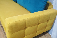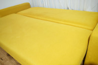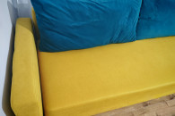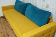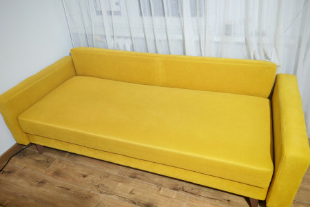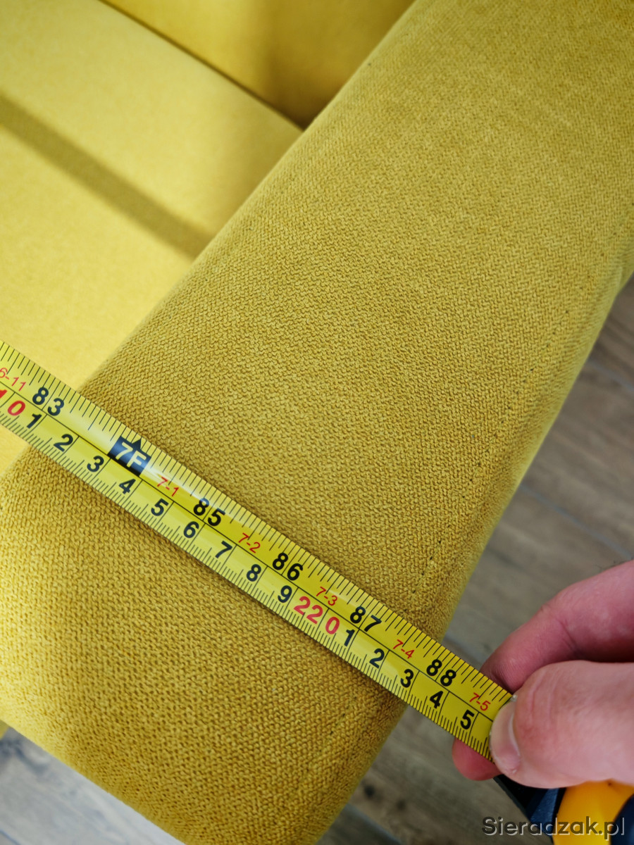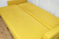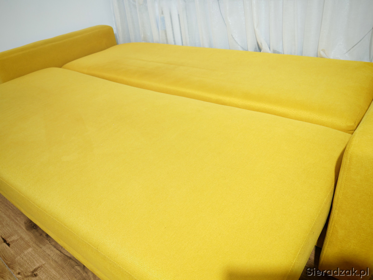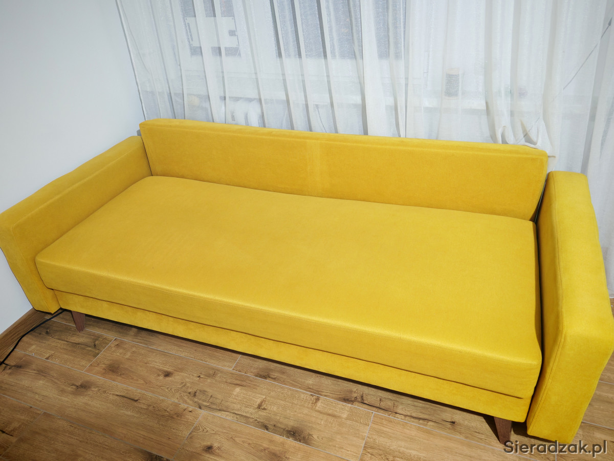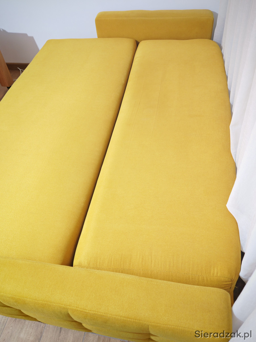 Mam do sprzedania 4 letnia sofę w kolorze musztardowym. Łóżko sprawne z funkcją spania 150x190 cm oraz pojemnikiem na pościel. Kanapa była prana około miesiąc temu. Na początku roku był wymieniany wkład w prawej części funkcji spania/w poparciu - szycie widoczne jedynie po rozłożeniu łóżka z prawej strony. Wymiar zewnętrzny 220 cm na 100 cm w przypadku złożonej sofy. Łóżko można zdemontować do transportu. Możliwy transport za dopłatą. Poduszki są w cenie łóżka.