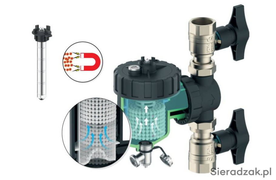 Filtr magnetyczny do instalacji grzewczych i pomp ciepła skutecznie usuwa cząstki żelaza i osady z wody, chroniąc zawory, siłowniki i pompę obiegową. Wykonany z mosiądzu, stali nierdzewnej i tworzywa PA66-GF30.