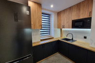 W kuchni płyta indukcyjna, zmywarka, lodówka, mikrofala, okap, piekarnik.