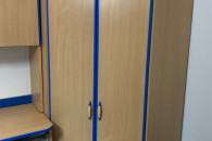 W skład zestawu wchodzą szafki z półkami oraz duża szafa podzielona na część z drążkiem do wieszania ubrań i część z półkami.