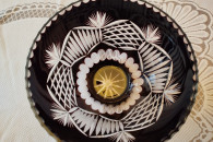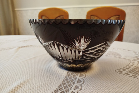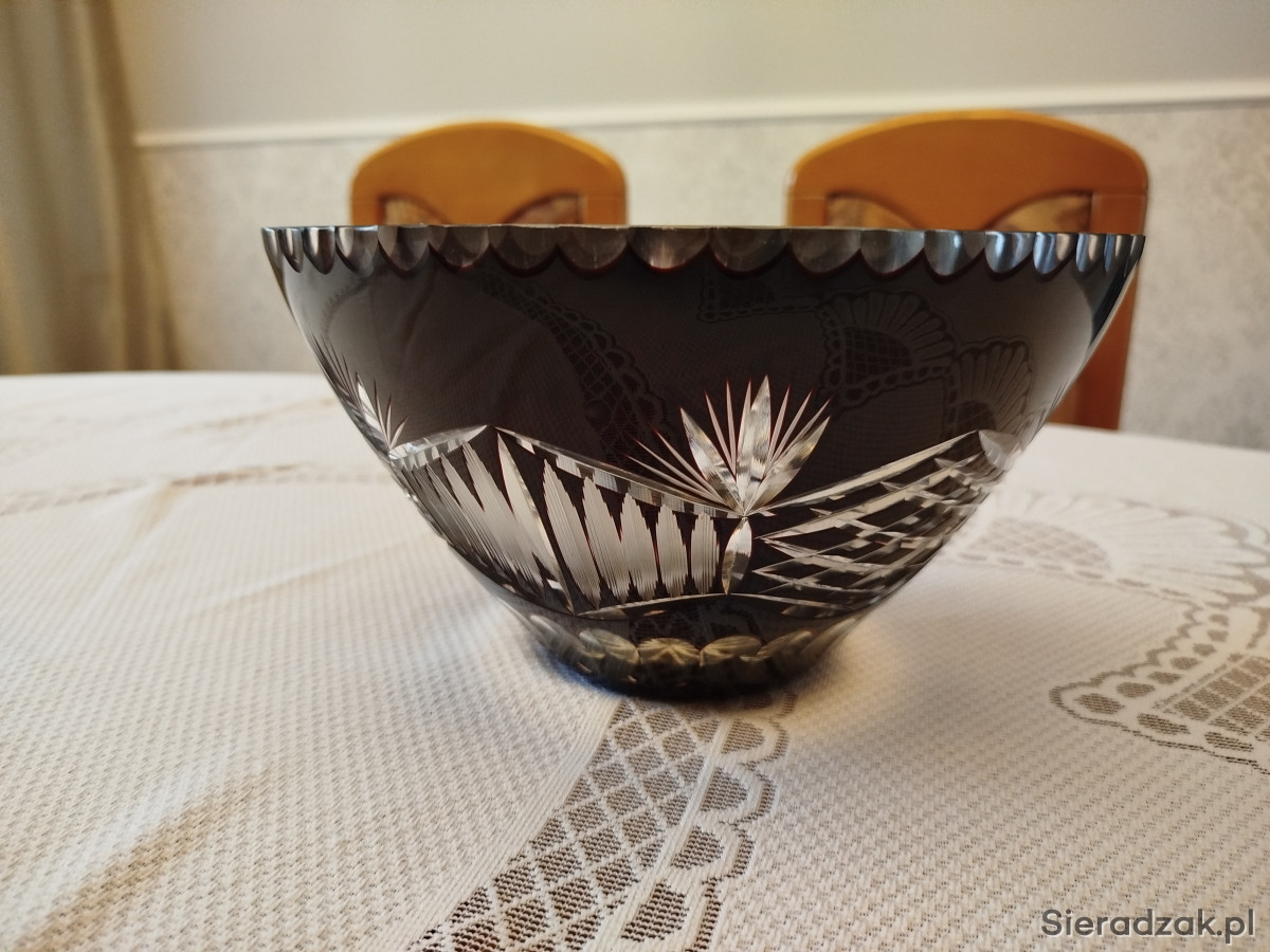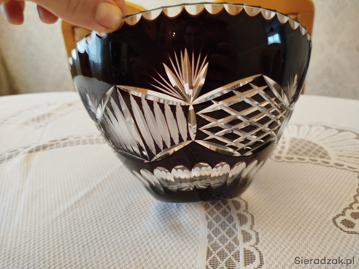 Sprzedam piękną kryształową misę z lat 60-tych. Misa w kolorze śliwkowo - bordowoym. Kolor się zmienia w zależności od padającego światła. Wysokość misy to 13,0 cm a średnica otworu to 23,5 cm