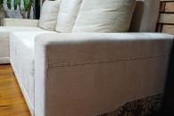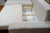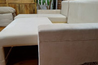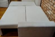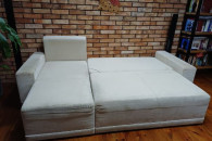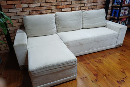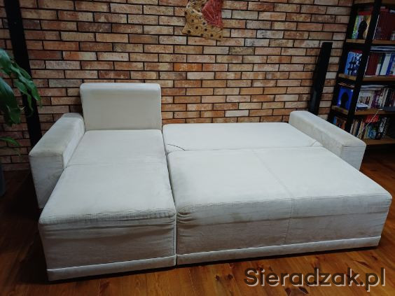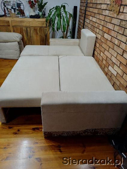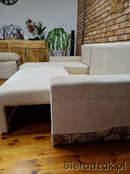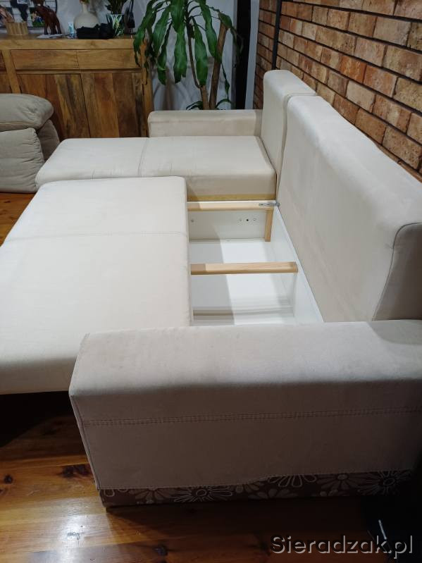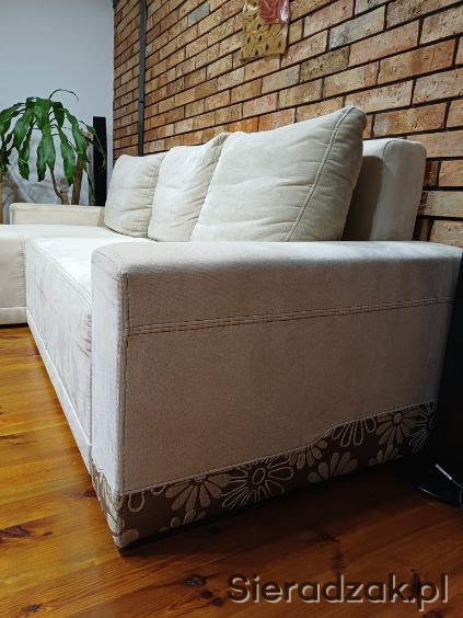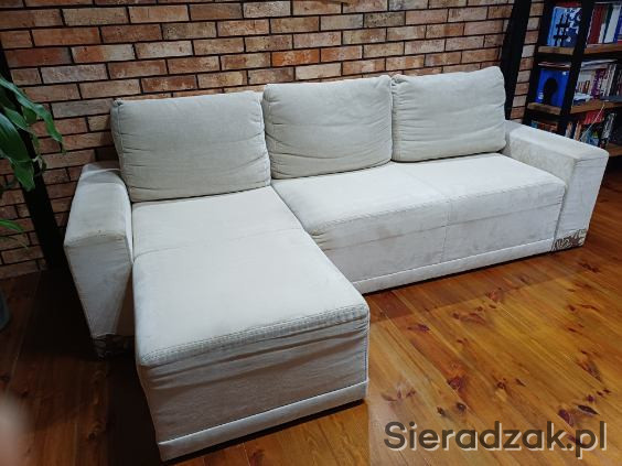 Wygodna, rozkładana sofa narożna w jasnym kolorze. Mebel w dobrym stanie, idealny do salonu lub pokoju dziennego.