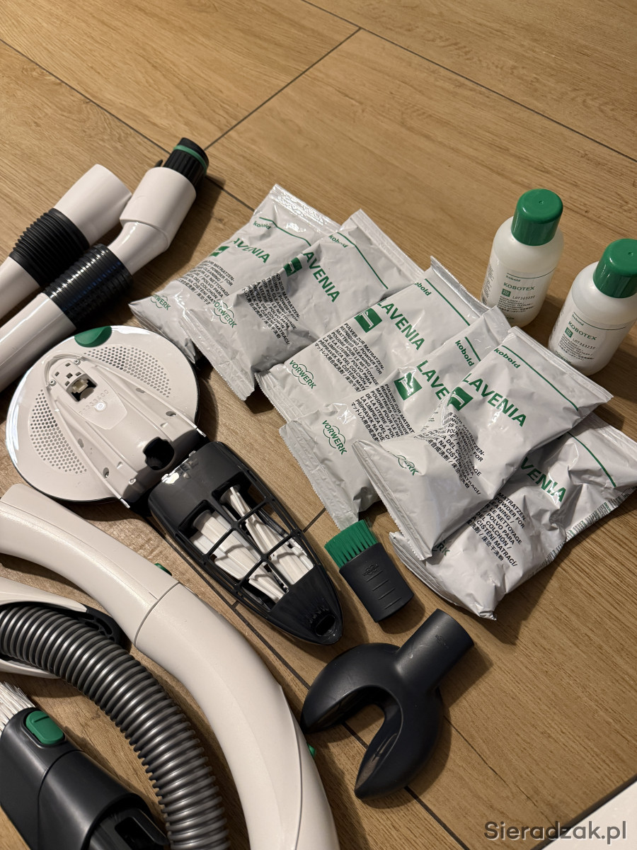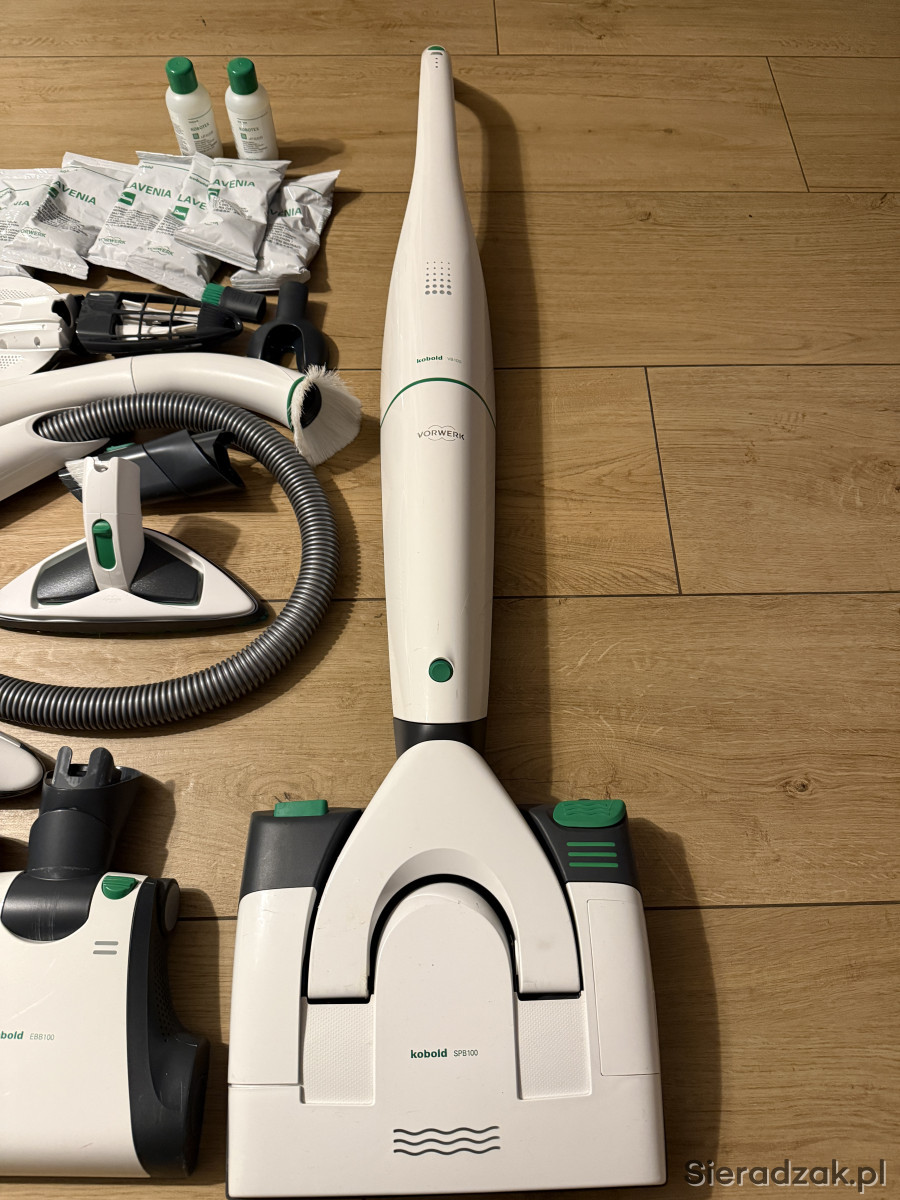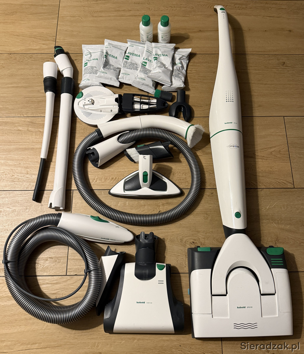 Pełny zestaw Kobolda VB100, cześć szczotek/końcówek użyta max. 2-3 razy. Posiada normalne ślady użytkowania, na zdjęciu kilka rzeczy brakuje - dorzucam sporą ilość worków, kilka filtrów, płyn do podłóg oryginalny (ok. połowa butelki).