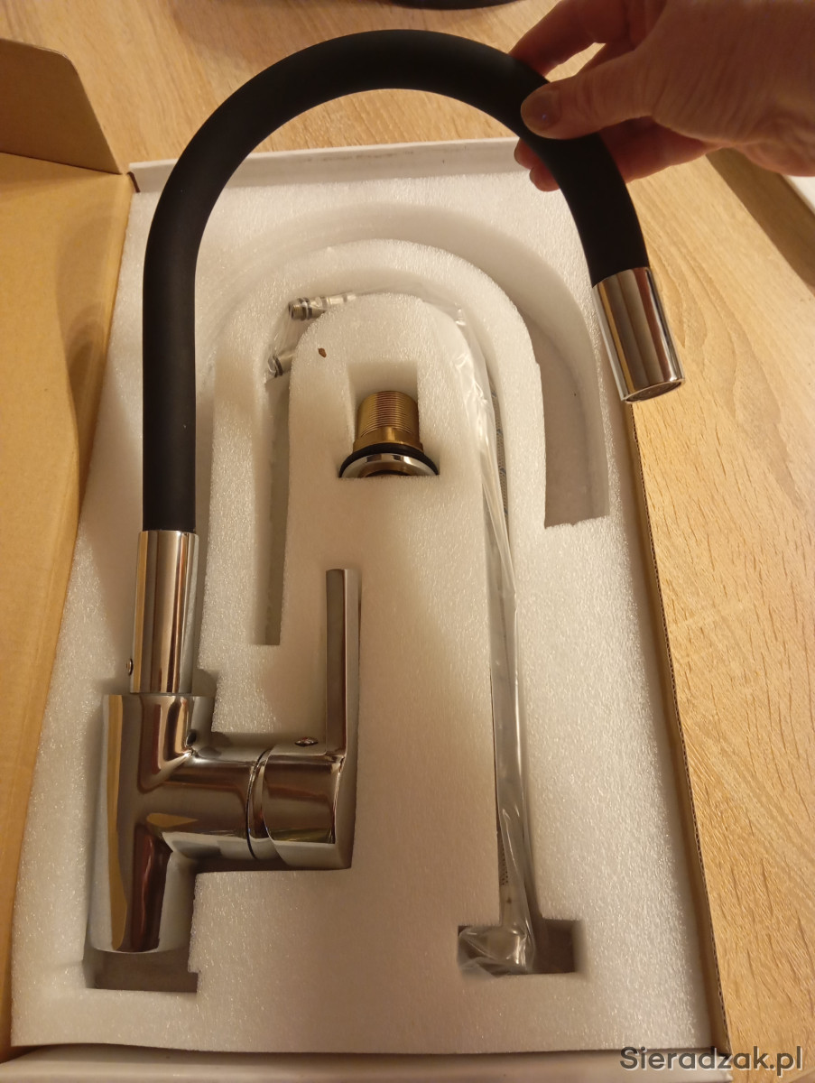 Sprzedam stojącą, nową i kompletną baterię w kolorze czarnym do zlewozmywaka czy umywalki. Bateria posiada giętką, ruchomą wylewkę świetnie sprawdzającą się np. w kuchni podczas nabierania wody do wysokiego garnka lub nalewania wody do wiadra stojącego poza umywalką POLECAM