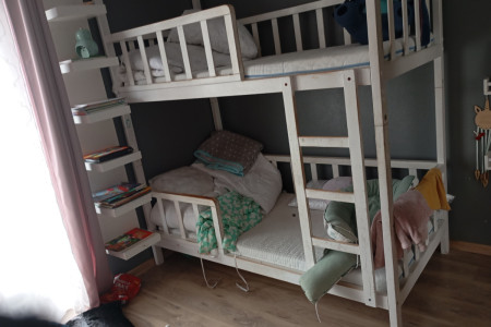 Łóżko piętrowe z materacami materace 180x90. Wysokość łóżka 246. Do łóżka jeszcze są dwie szuflady suwane. Łóżko jest do przemalowania. Można je zrobić na dwa osobne łóżka 724861848