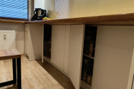 * kuchnia z pozostawionymi meblami i sprzętem w zabudowie