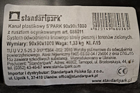 Kanał plastikowy S'PARK 90x90x1000 mm z rusztem ocynkowanym, modułowy (możliwość łączenia) Służy do odwodnienia liniowego strefy pieszej i terenów zielonych. Wymiary: 90x90x1000 mm, waga: 1,33 kg. Produkt nowy nie używany.