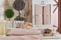 Wyjątkowy zestaw ręczników frotte, wykonany w 100% z naturalnej bawełny. Ręczniki zdobią materiałowe bordiury z dużym, mieniącym się haftem. Klasyczny design dopełni każde wnętrze, a stylowa kolorystyka kolekcji przypadnie do gustu zarówno mężczyznom, jak i kobietom.