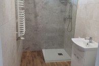 * łazienka: prysznic, umywalka, toaleta, szafka łazienkowa