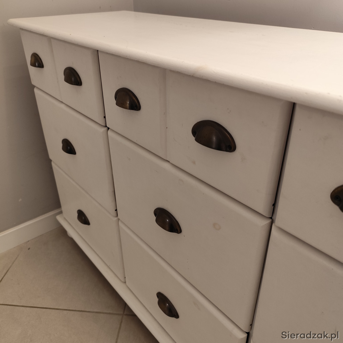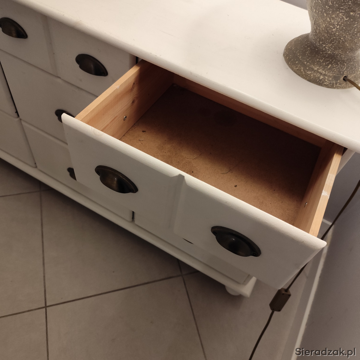 Sprzedam drewnianą komodę koloru białego o wymiarach: szerokosc 134cm, głębokość 39cm, wysokość 79,5cm