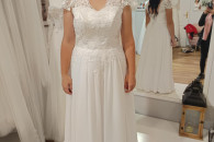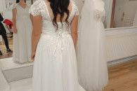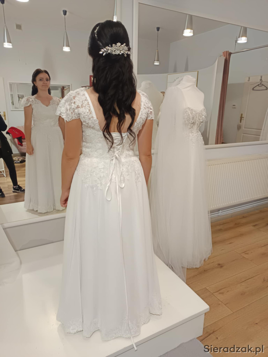 Sprzedam sukienkę ślubną rozmiar S/M na wzrost 150 cm + obcas. Suknia szyta na indywidualne zamówienie w salonie sukien ślubnych Jadwigi Michalak. Użyta raz 18 października bieżącego roku. Suknia w kolorze śnieżnej bieli, do delikatnych poprawek krawieckich ,ponieważ w dwóch miejscach podczas czyszczenia miejscami odczepiła się koronka. Spokojnie może to poprawić lokalna krawcowa. Do sukni mam również obuwie ślubne firmy Kotyl ze skóry naturalnej w rozmiarze 35. (120 zł ) Zainteresowanych zapraszam. Suknia zapakowana w oryginalny pokrowiec i folie ochronną. Suknia prezentuje się na żywo przepięknie na koronkach są delikatne cekinki, które dodają blasku. Gratis mogę dorzucić ozdoby do włosów i podwiązkę. Cena nowej to koszy około 3500 zł.