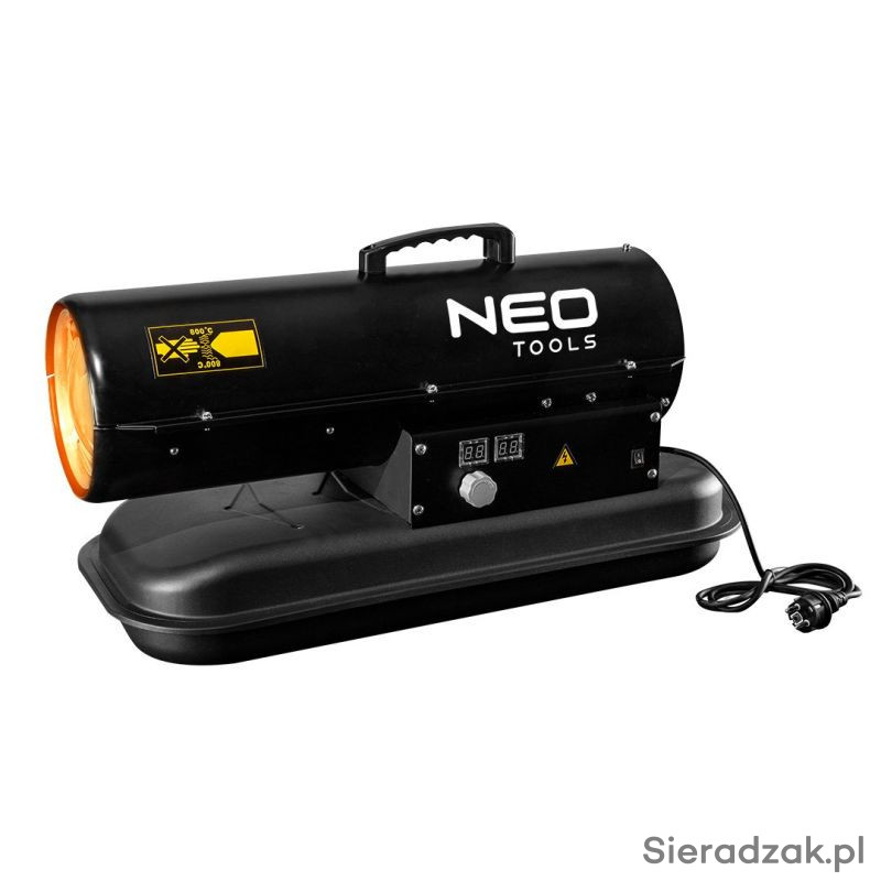 Nagrzewnica olejowa 20 kW, zbiornik 19 l, bez kółek 90-080 marki NEO o mocy 20 kW, wyposażona w termostat i przełącznik regulacji temperatury. Posiada wentylator o przepływie powietrza 550 m3/h. Zasilana naftą lub olejem napędowym, charakteryzuje się zużyciem na poziomie 1,9 l/h. Zbiornik na paliwo ma pojemność 19 l. Nagrzewnica przeznaczona jest do przenoszenia, nie ma kółek. Prosta w obsłudze, z trwałą, metalową obudową i solidną konstrukcją. Czujnik płomienia odcina zasilanie w przypadku wykrycia brak oleju, a kontrolka sygnalizacji awarii wpływa na bezpieczeństwo użytkowania urządzenia. Nagrzewnica wyposażona jest w przewód o długości 1,3 m. Jej waga wynosi 14 kg, a wymiary 420 x 770 x 320 mm. Będzie niezbędna na placach budowy, na halach i magazynach.