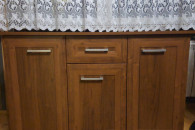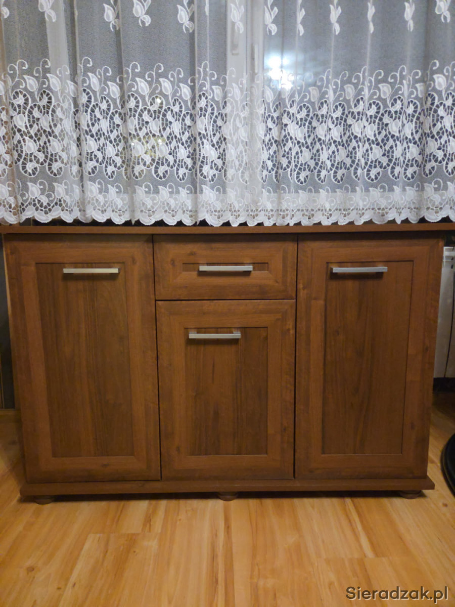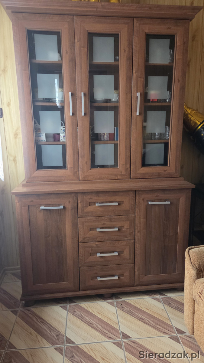 Solidne dwie komody z szufladami i drzwiczkami oraz witryna stawiana na jednej z komód w ciemnym kolorze drewna. Idealne do przechowywania rzeczy w salonie lub sypialni. Meble używane, ale w bardzo dobrym stanie. Wymiary to około: szerokość: 122cm, głebokość: 48cm, wysokość komód dolnych: 82 cm , natomiast tej z witryną łacznie z dolną to 197cm. Cena za całość. W razie pytań lub potrzeby przesłania dodatkowych zdjęć zapraszam do kontaktu.