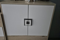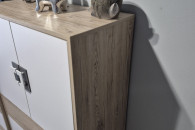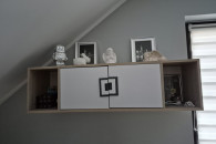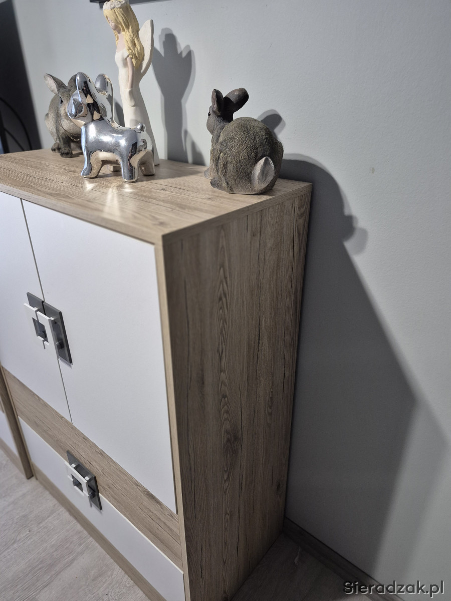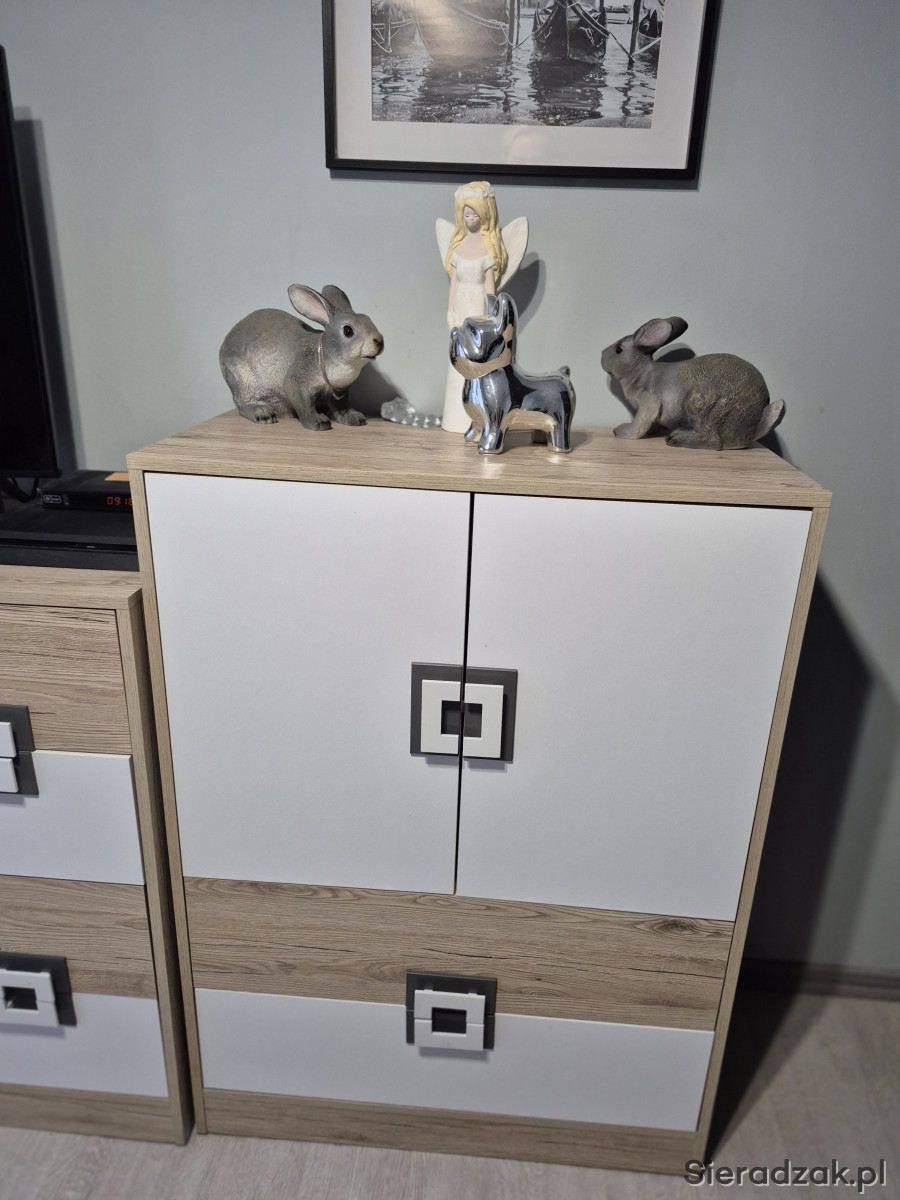 Nowoczesna komoda z szufladami i półkami, idealna do urządzenia pokoju dziecięcego lub nastolatka.