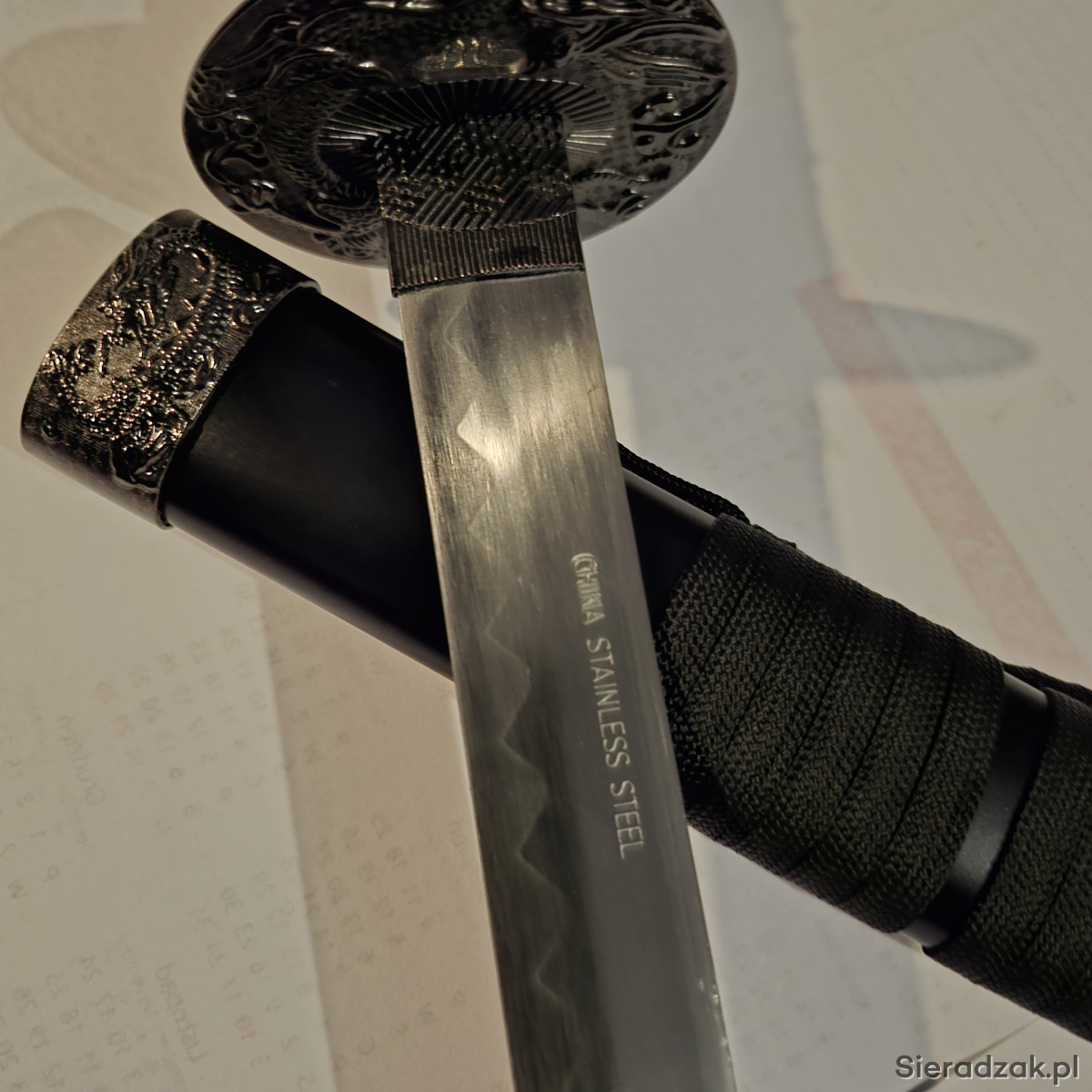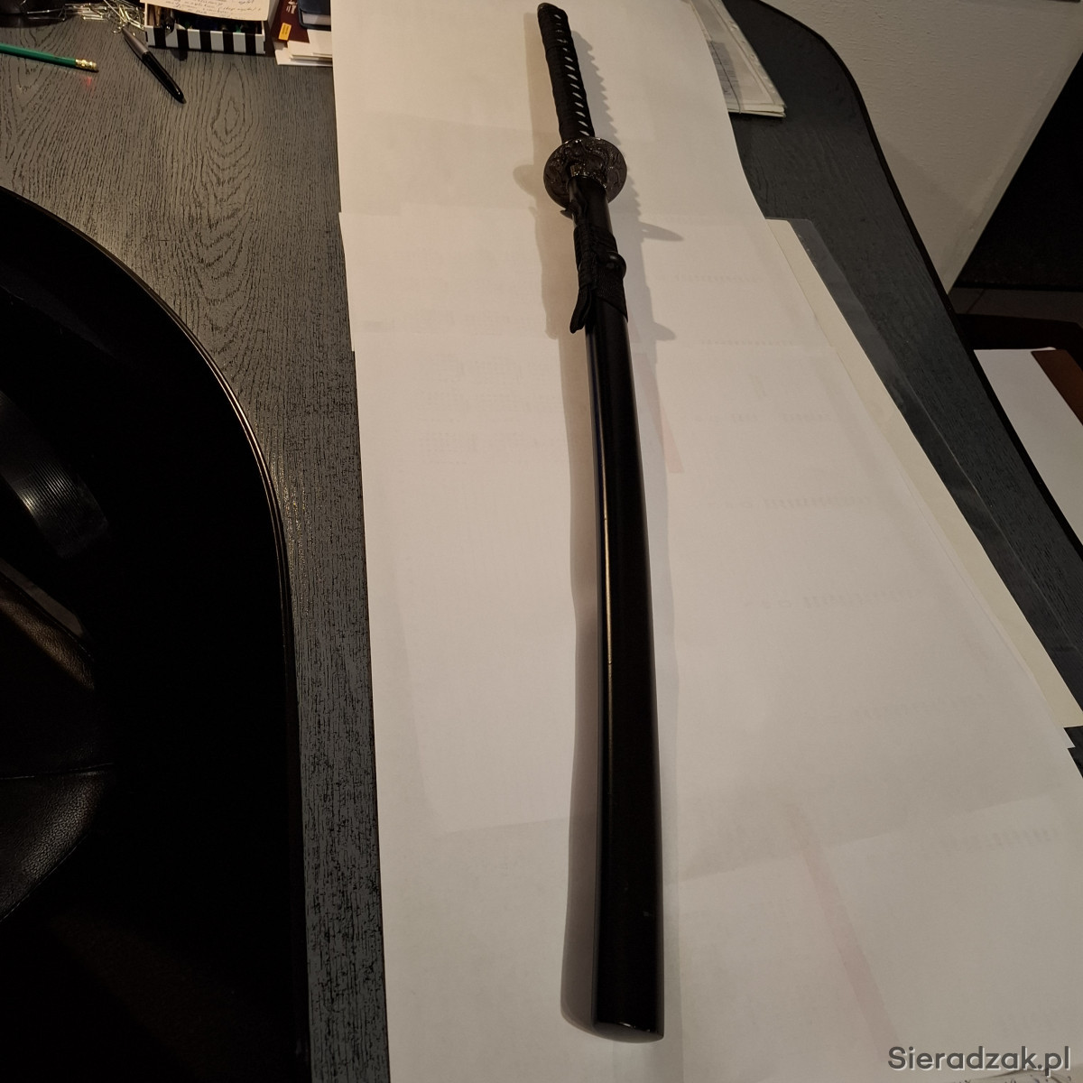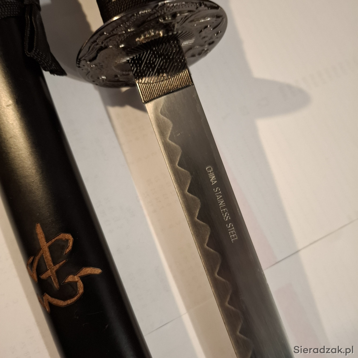 Miecz wykonany na wzór XVIII - XIX w. katan samurajskich. Ostrze ze stali węglowej, ze wzorem - hamon - i napisami. Rękojeść z oplotem bawełnianym. Tsuba ozdobna -z motywami smoków. Pochwa lakierowana na czarno, z japońskimi znakami. Długość w pochwie - 102 cm.
