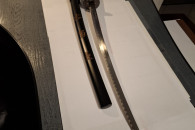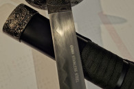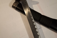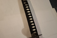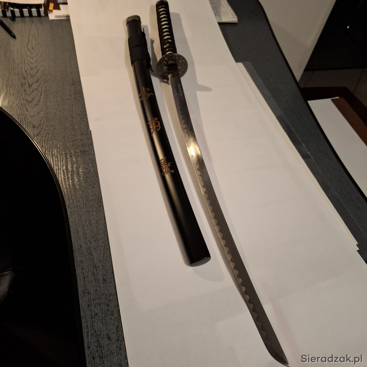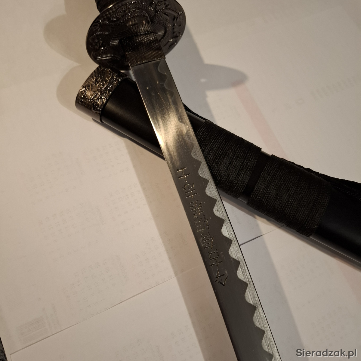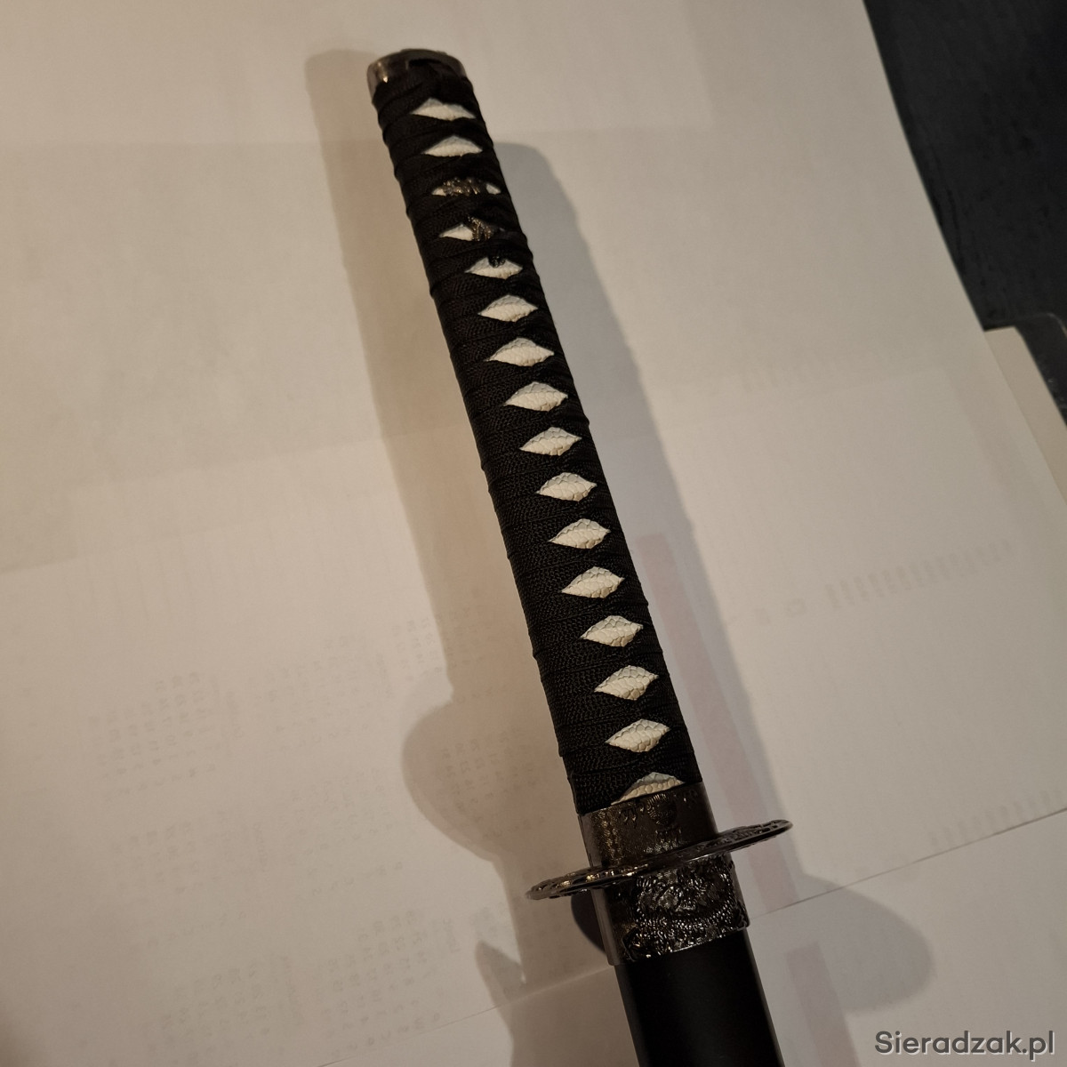 Miecz wykonany na wzór XVIII - XIX w. katan samurajskich. Ostrze ze stali węglowej, ze wzorem - hamon - i napisami. Rękojeść z oplotem bawełnianym. Tsuba ozdobna -z motywami smoków. Pochwa lakierowana na czarno, z japońskimi znakami. Długość w pochwie - 102 cm.