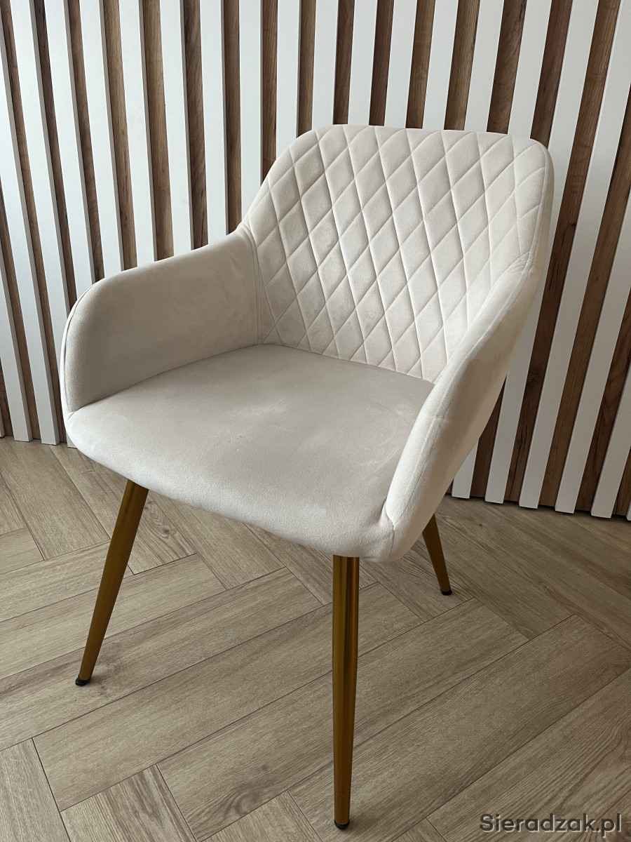 Bardzo wygodne i eleganckie krzesło w kolorze jasnego beżu ze złotymi nogami. Może być do burka jak i do toaletki. Polecam