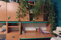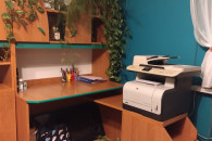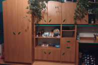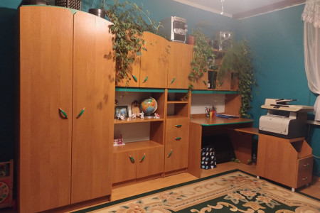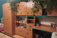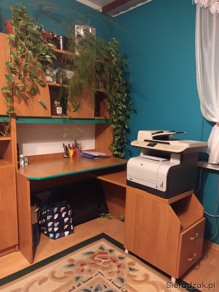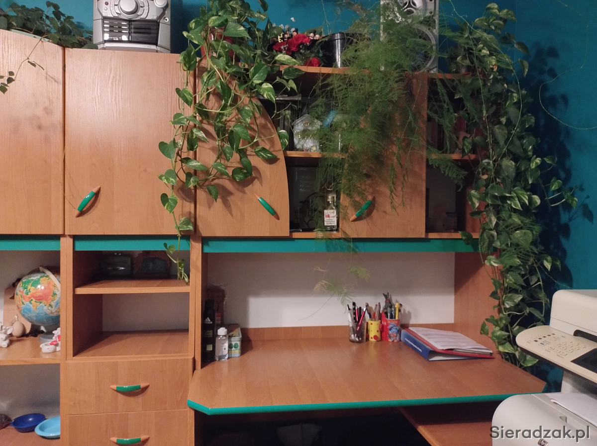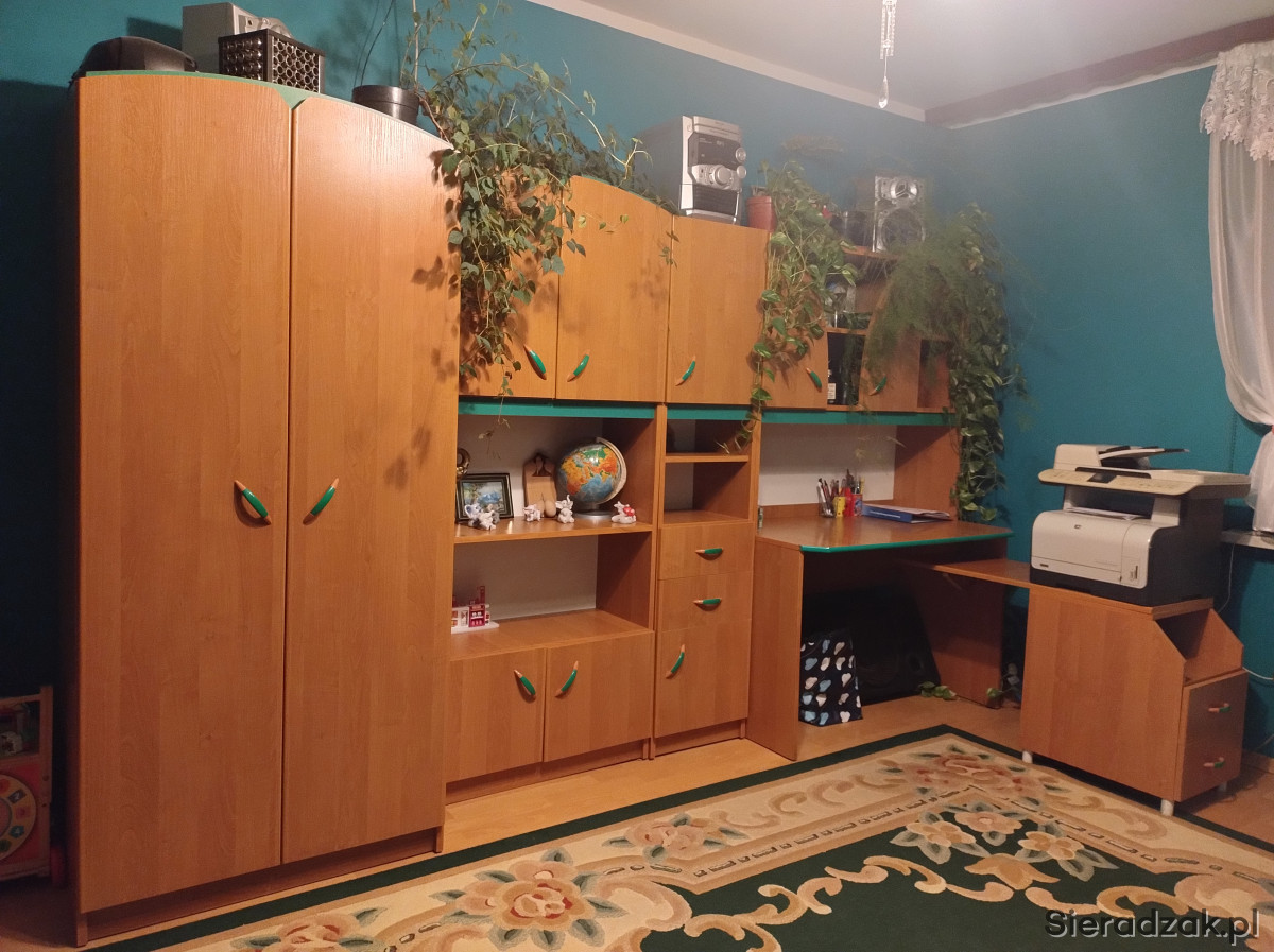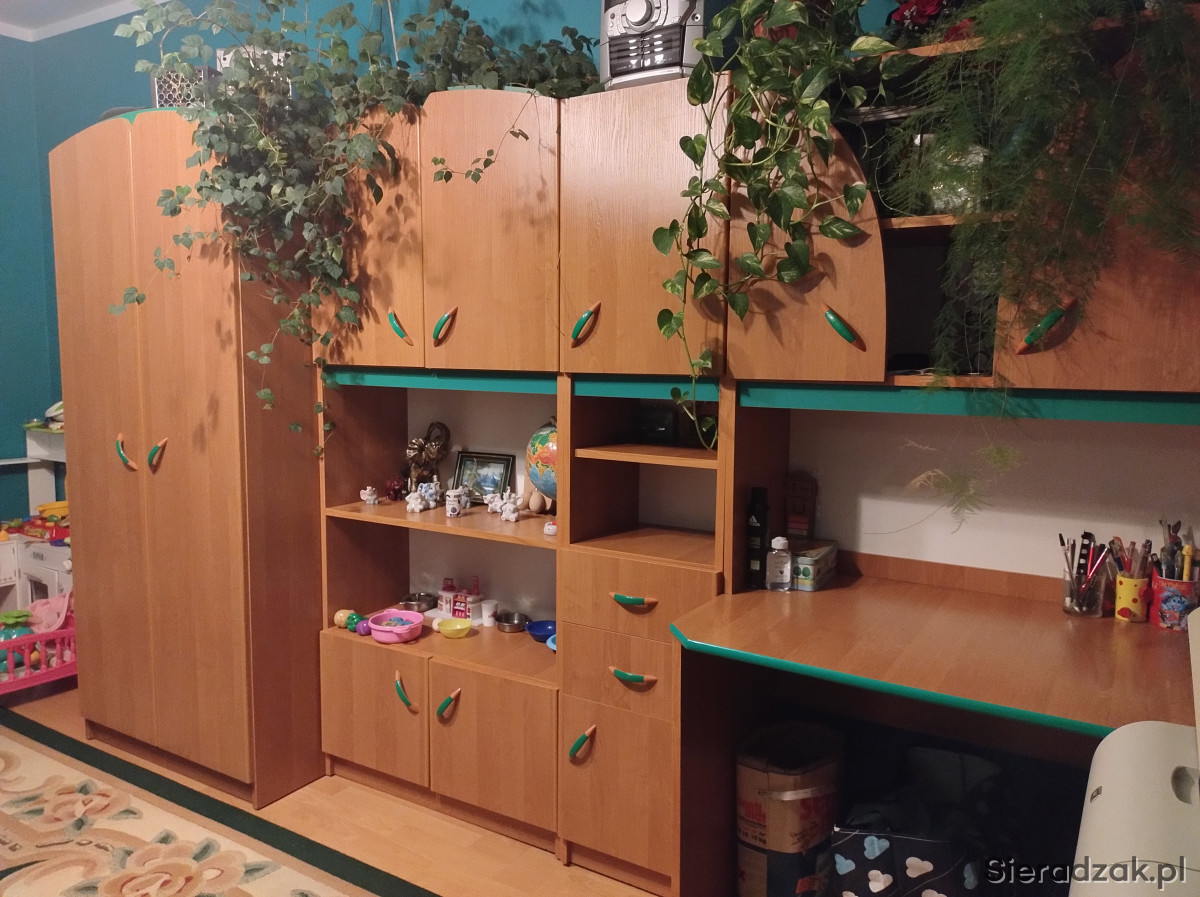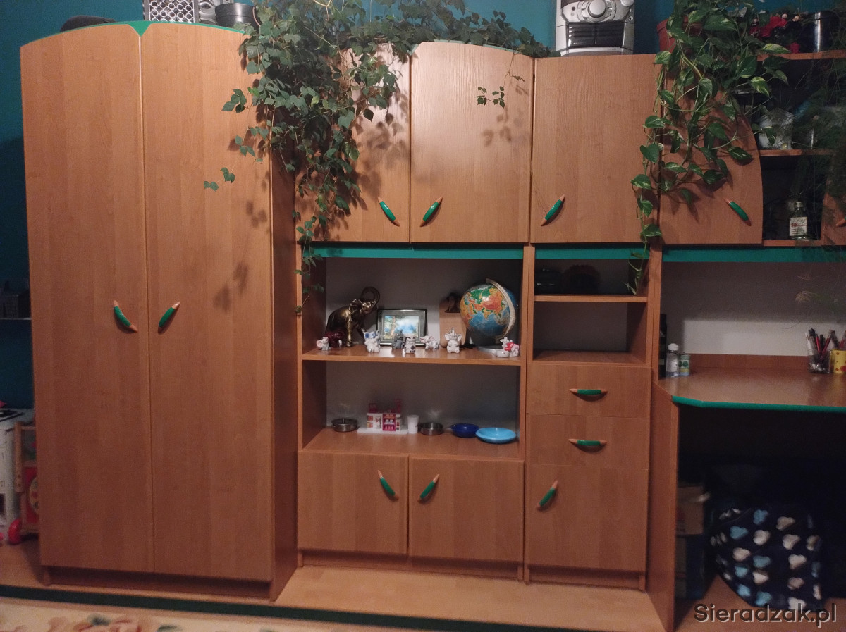 Meble młodzieżowe w dobrym stanie. Szafa, regał i biurko z dostawianą szafką i blatem w ciepłym odcieniu drewna z dekoracyjnymi elementami. Umeblowanie pasujące do pokoju młodzieżowego lub dziecięcego. Funkcjonalne i praktyczne rozwiązanie do przechowywania i organizacji przestrzeni.